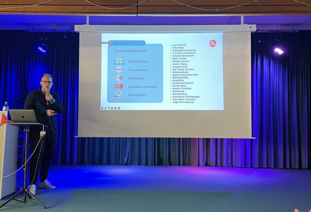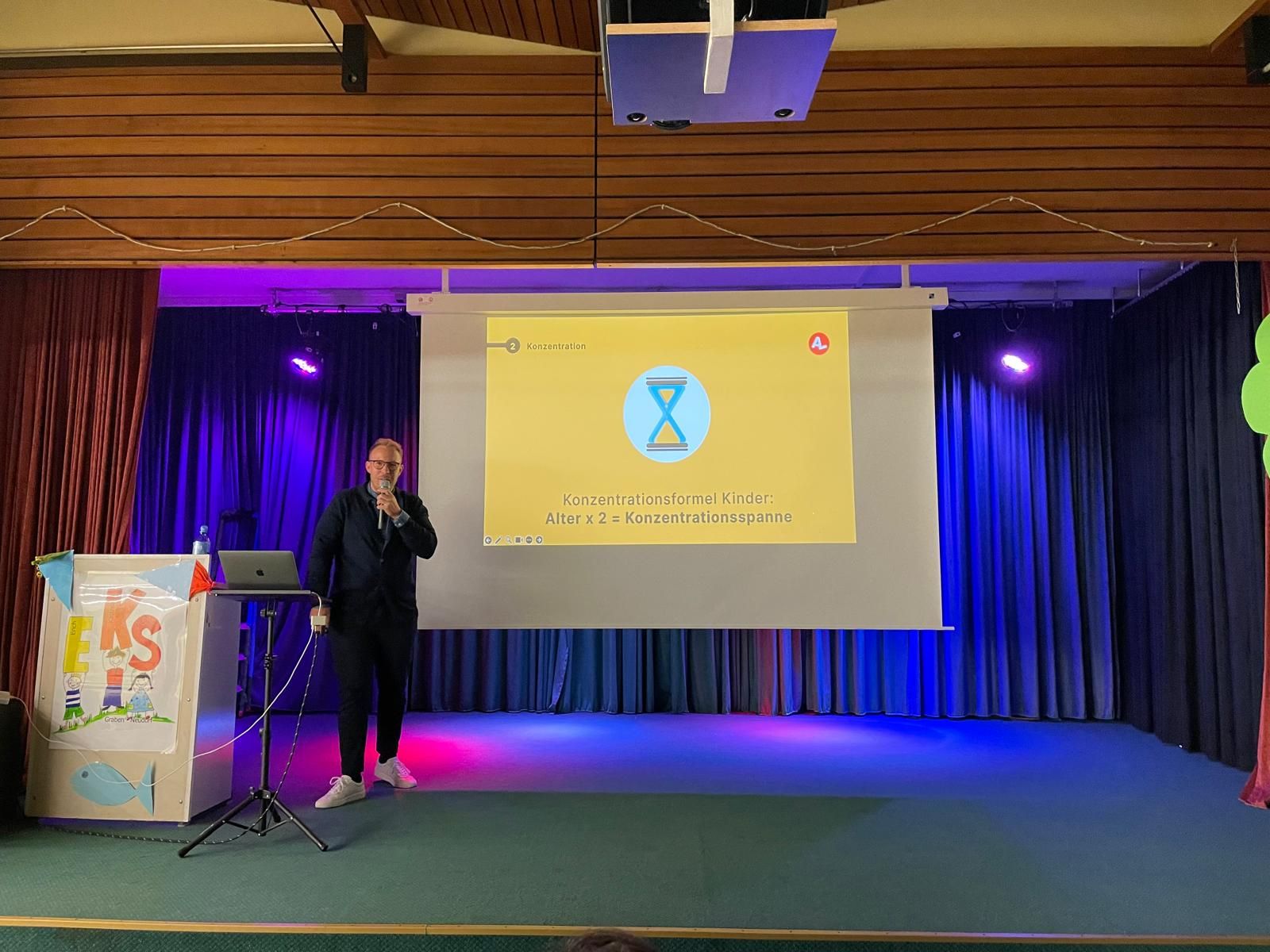 Am 16.10.2025 fand in der Aula der Erich Kästner-Schule eine Veranstaltung der Akademie für Lernpädagogik zum Thema „Entspannter lernen zu Hause – Lernen macht glücklich“ statt. Der Dozent Herr Spitz gab dabei viele praktische Hinweise, wie Eltern ihre Kinder beim Lernen zu Hause besser unterstützen können. Im Mittelpunkt standen Themen wie Lernmotivation, Struktur im Alltag und der Umgang mit Lernfrust. Herr Spitz betonte, wie wichtig eine positive Lernatmosphäre und regelmäßige Pausen sind. Auch einfache Rituale und feste Lernzeiten können helfen, den Alltag zu entspannen und das Lernen effektiver zu gestalten. Die Veranstaltung war informativ und bot hilfreiche Anregungen für die Eltern.