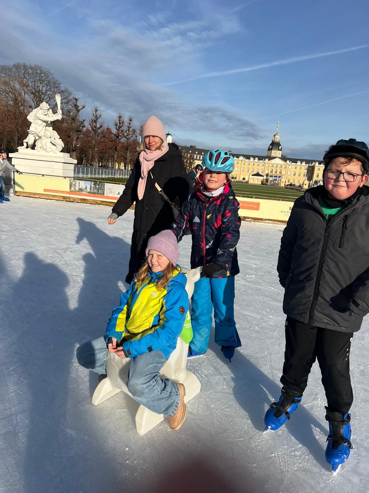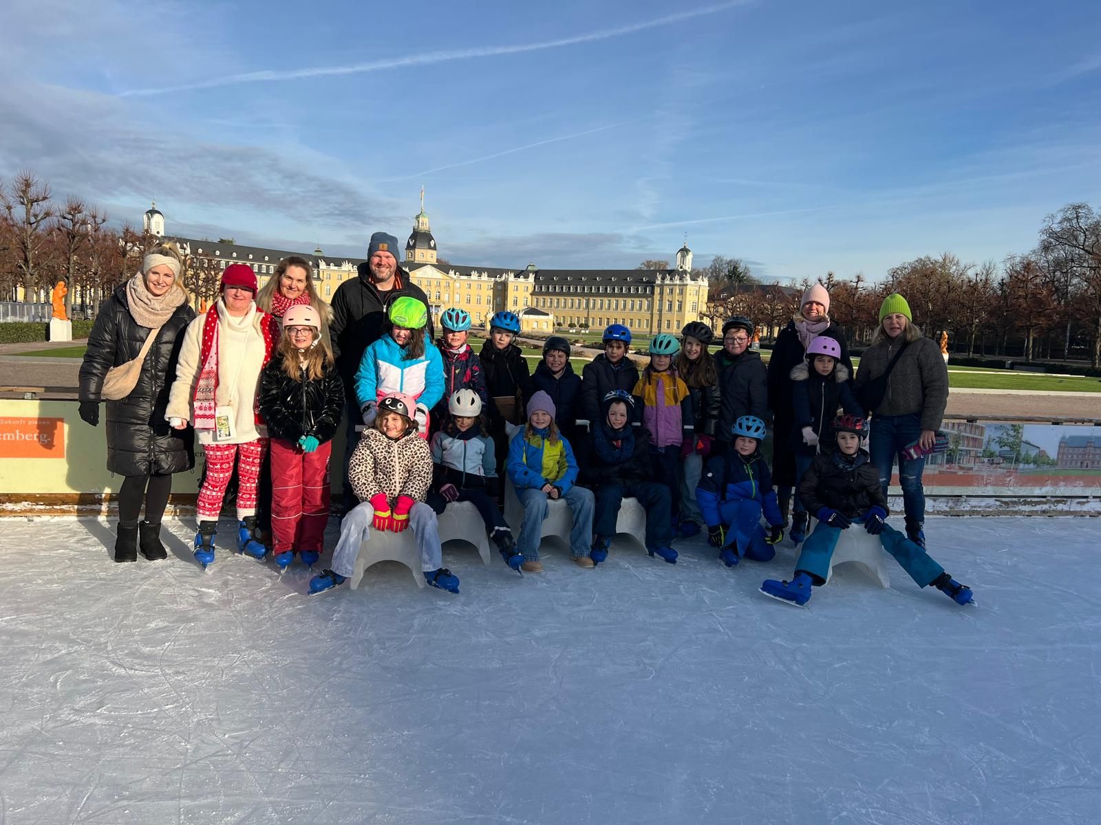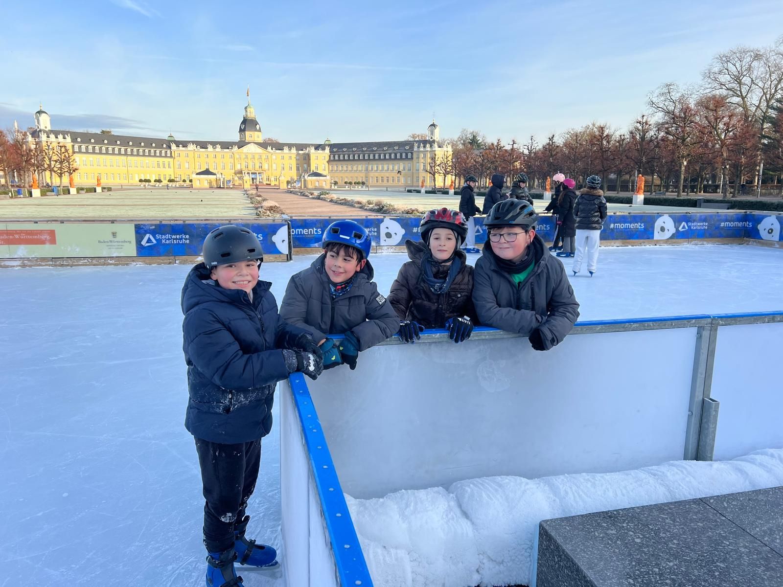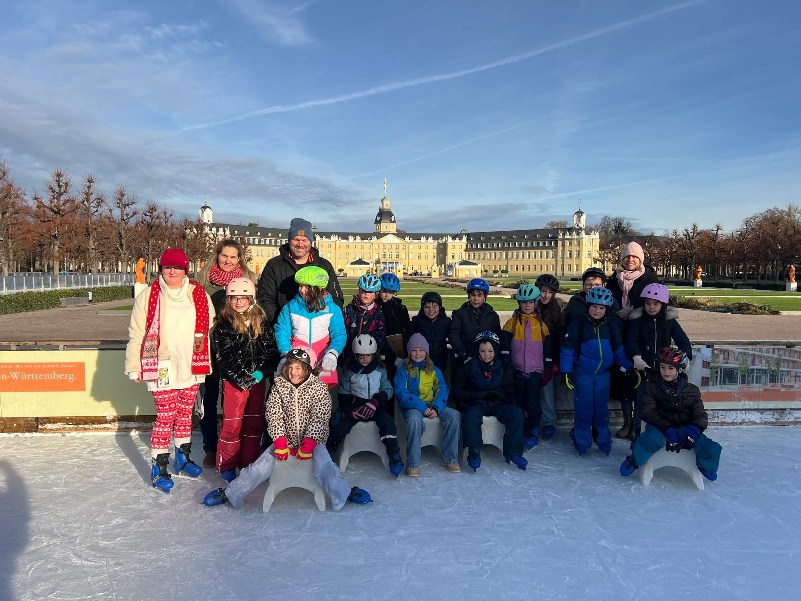 Endlich konnten die Schülerinnen und Schüler der Klasse 3b am letzten Dienstag mit ihrer Klassenlehrerin Frau Klauber und den begleitenden Eltern vor der schönen Kulisse des Karlsruher Barockschlosses ihre Runden auf der großen Eisbahn drehen.