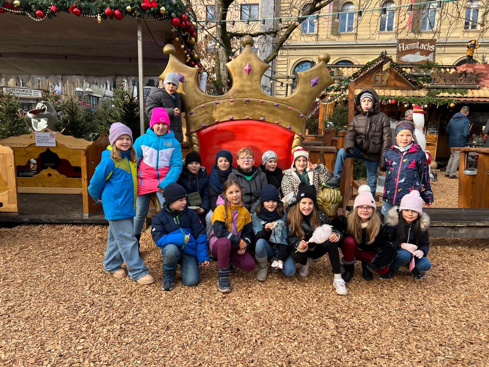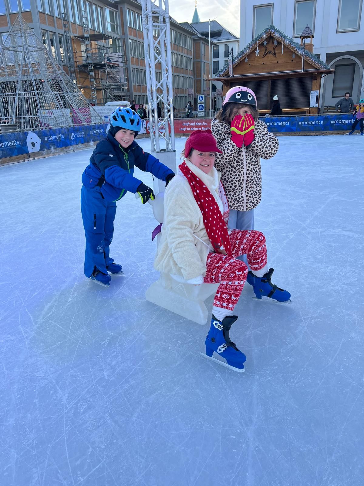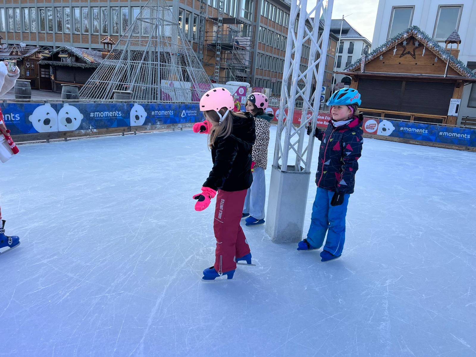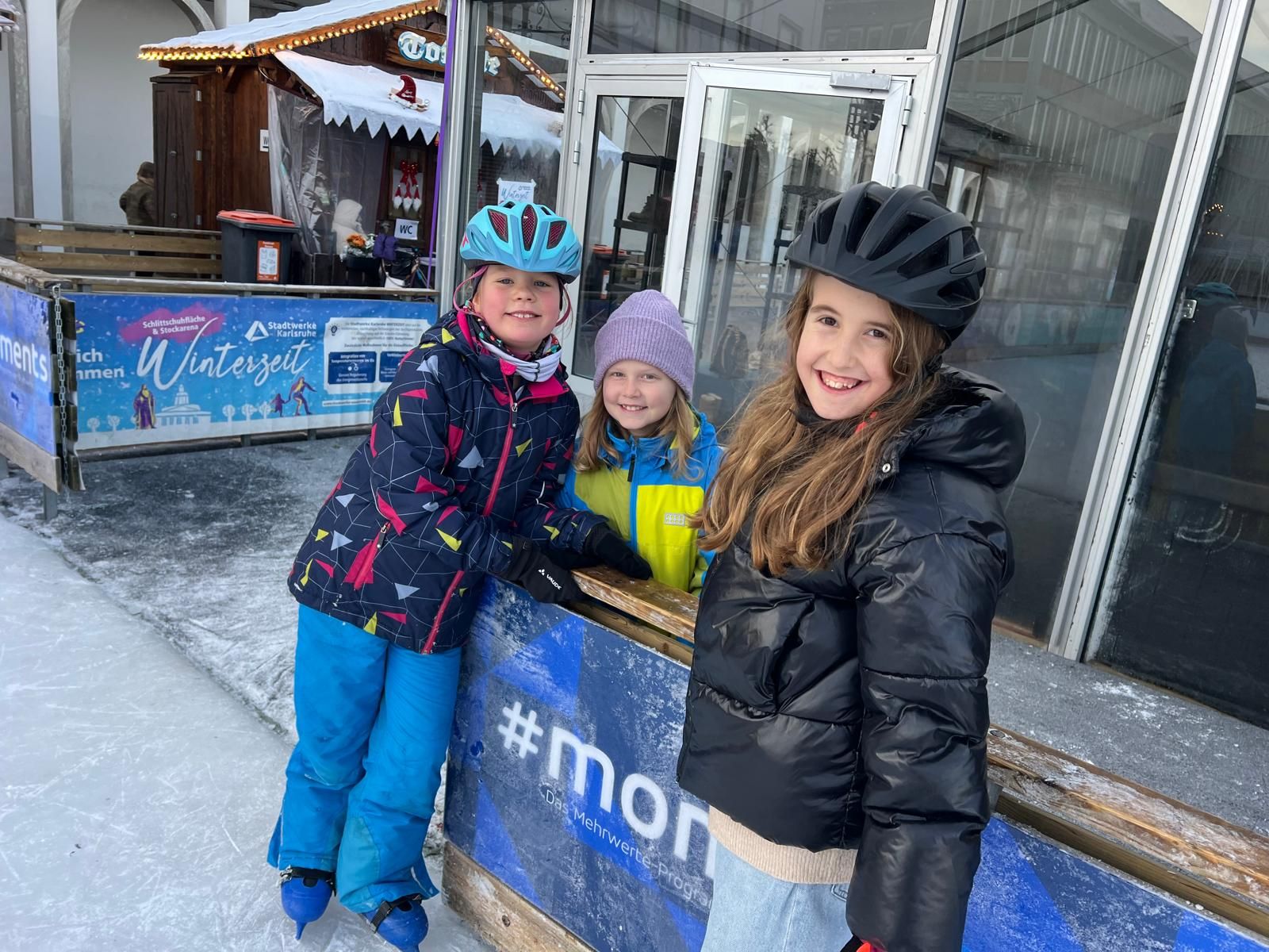 Bei herrlichem Sonnenschein begaben sich alle Kinder mutig auf das Eis und fanden schnell Sicherheit auf wackeligen Schlittschuhen. Gegenseitiges Helfen, Motivieren und dem anderen Vertrauen schenken wurden spielerisch trainiert und stärkten so das „Wir“-Gefühl. Aus manchem ungeübten Fahrer wurde so ein rasanter Kufengleiter. Glücklich über ihre gelungenen Fahrkünste besuchte dann die Klasse noch den Kinderweihnachtsmarkt vor der Stephanskirche. So manches Kind, hungrig geworden durch zahlreiche Pirouetten und Wettläufe auf dem Eis, verspeiste noch so manche Leckerei.