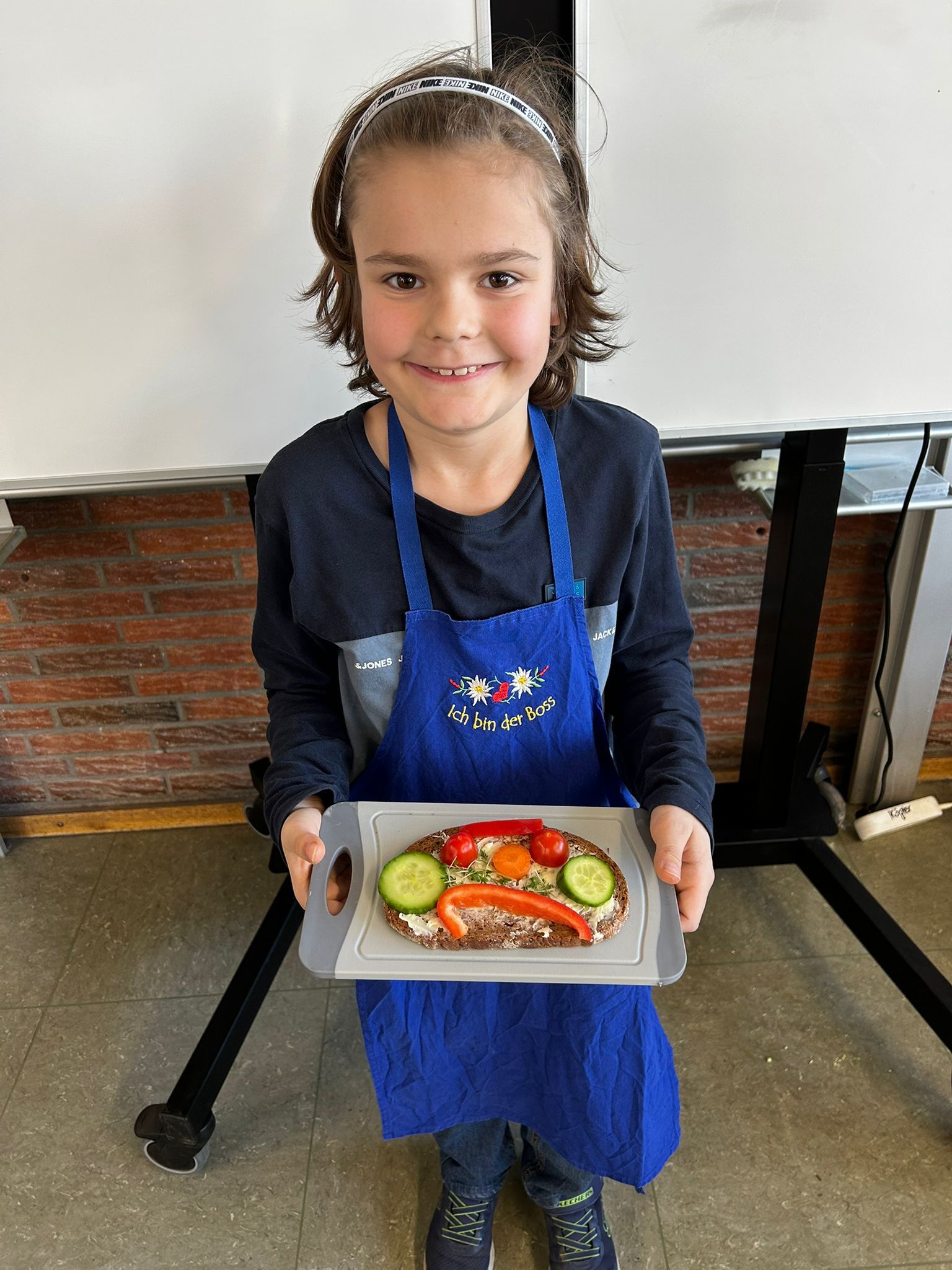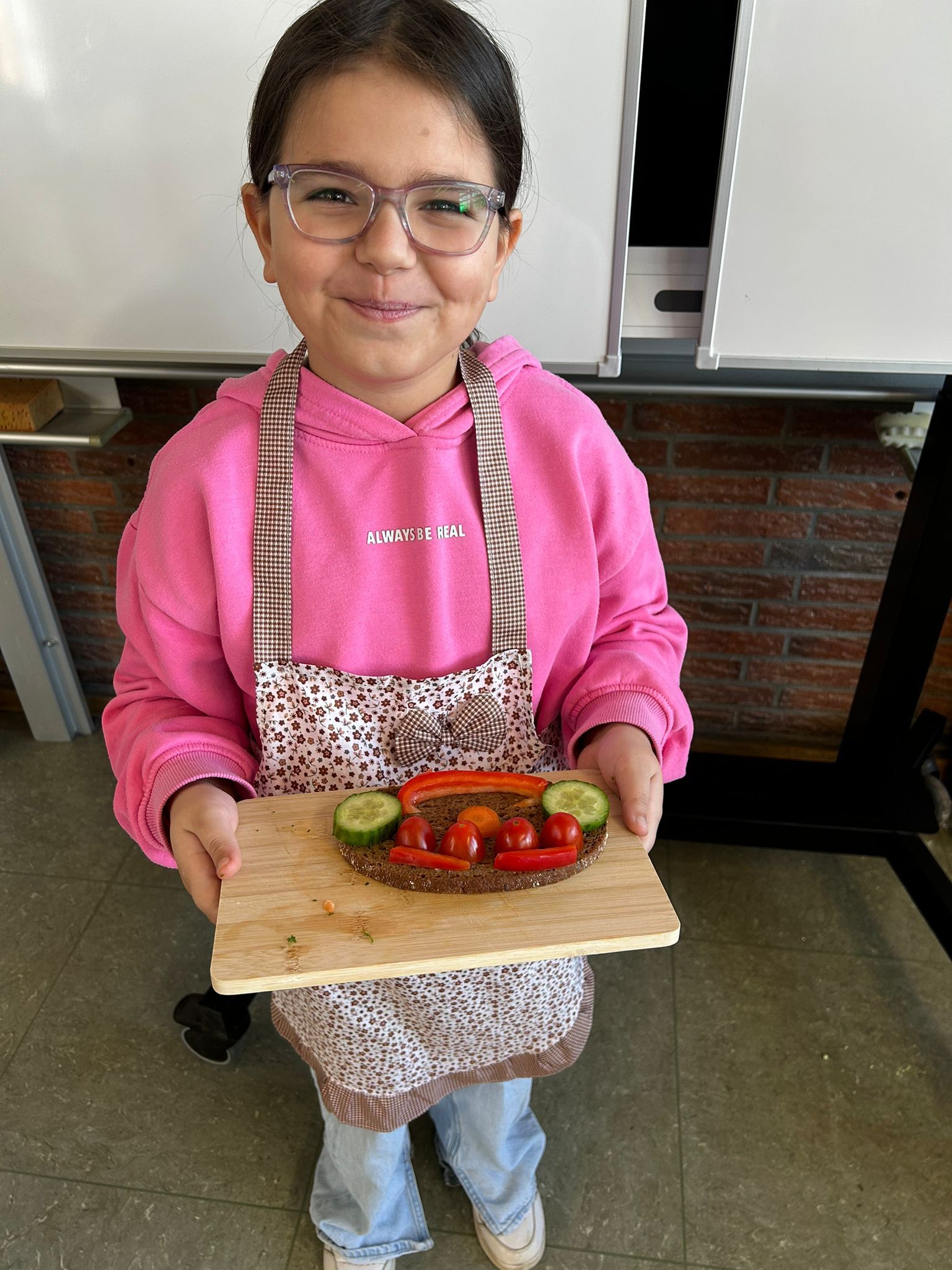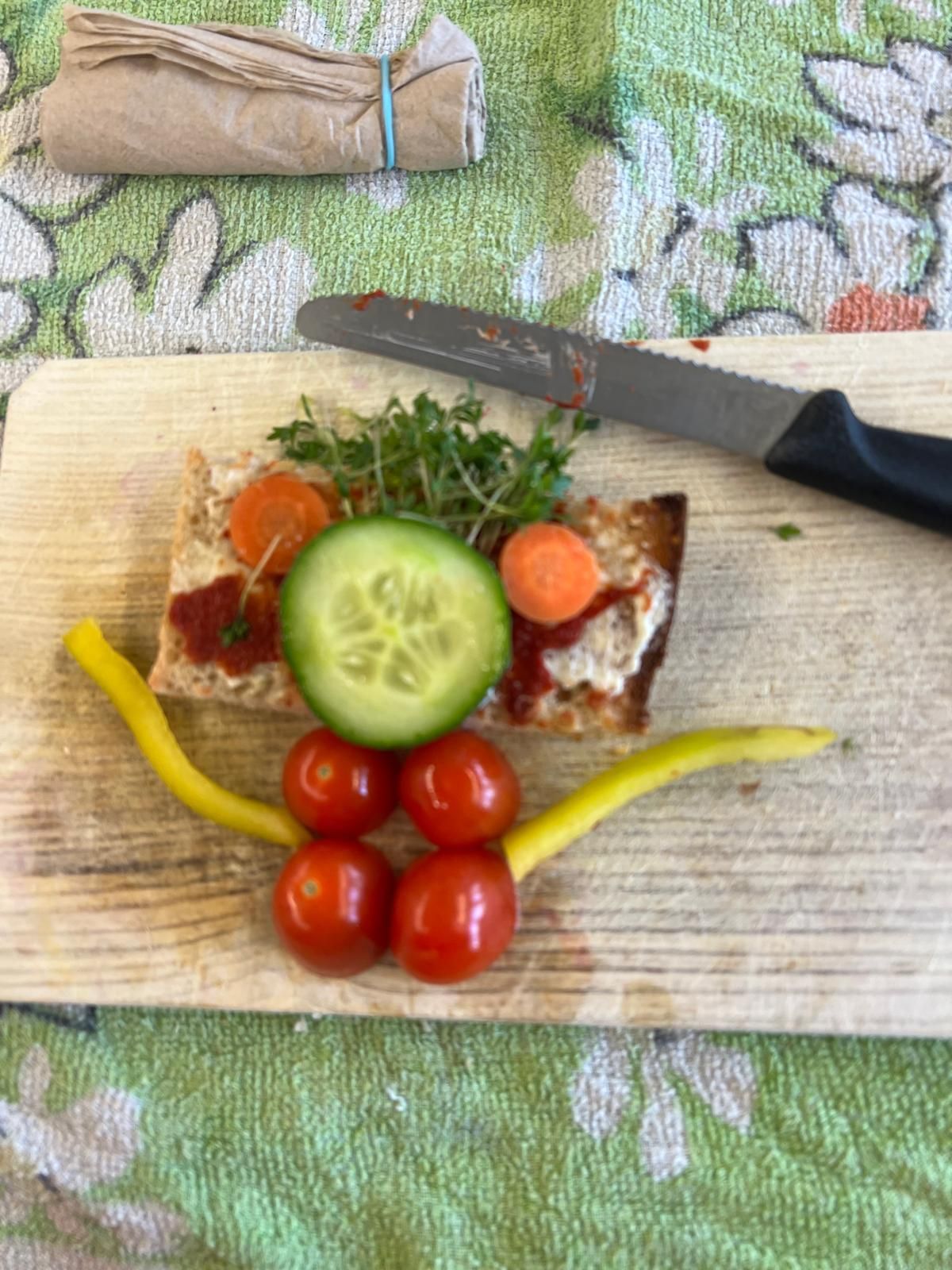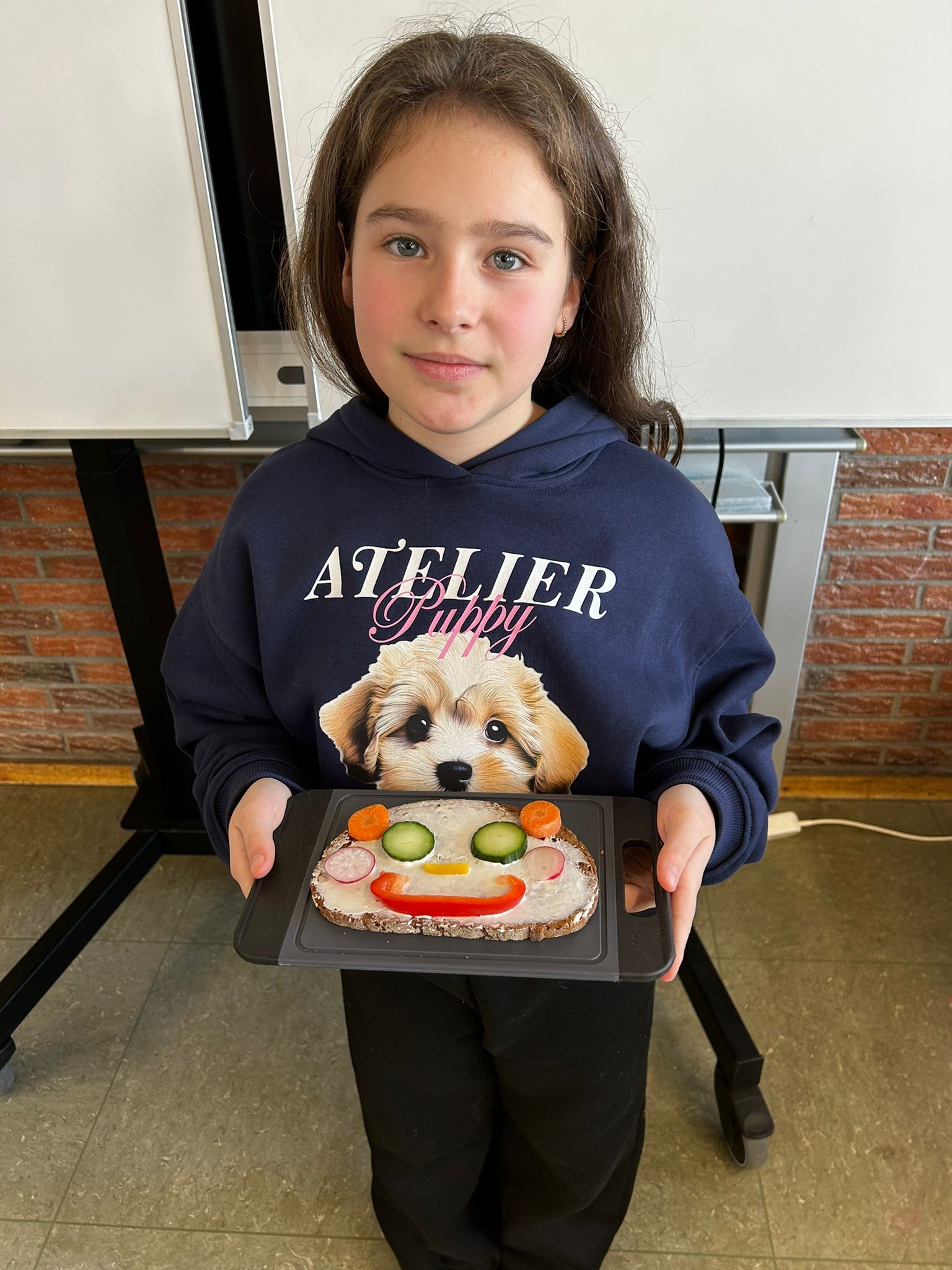 Im weiteren Verlauf gestalteten die Kinder Pausenbrot-Gesichter und lernten dabei spielerisch, wie man mit ausgewogenen Zutaten arbeitet. Nach gründlicher Handhygiene ging es ans Schneiden: Paprika, Radieschen, Gurke, Karotten, Tomaten und Kresse wurden zu bunten Brotgesichtern verarbeitet. Die übrig gebliebenen Gemüsesorten fanden rasch ihren Weg in den Mund.