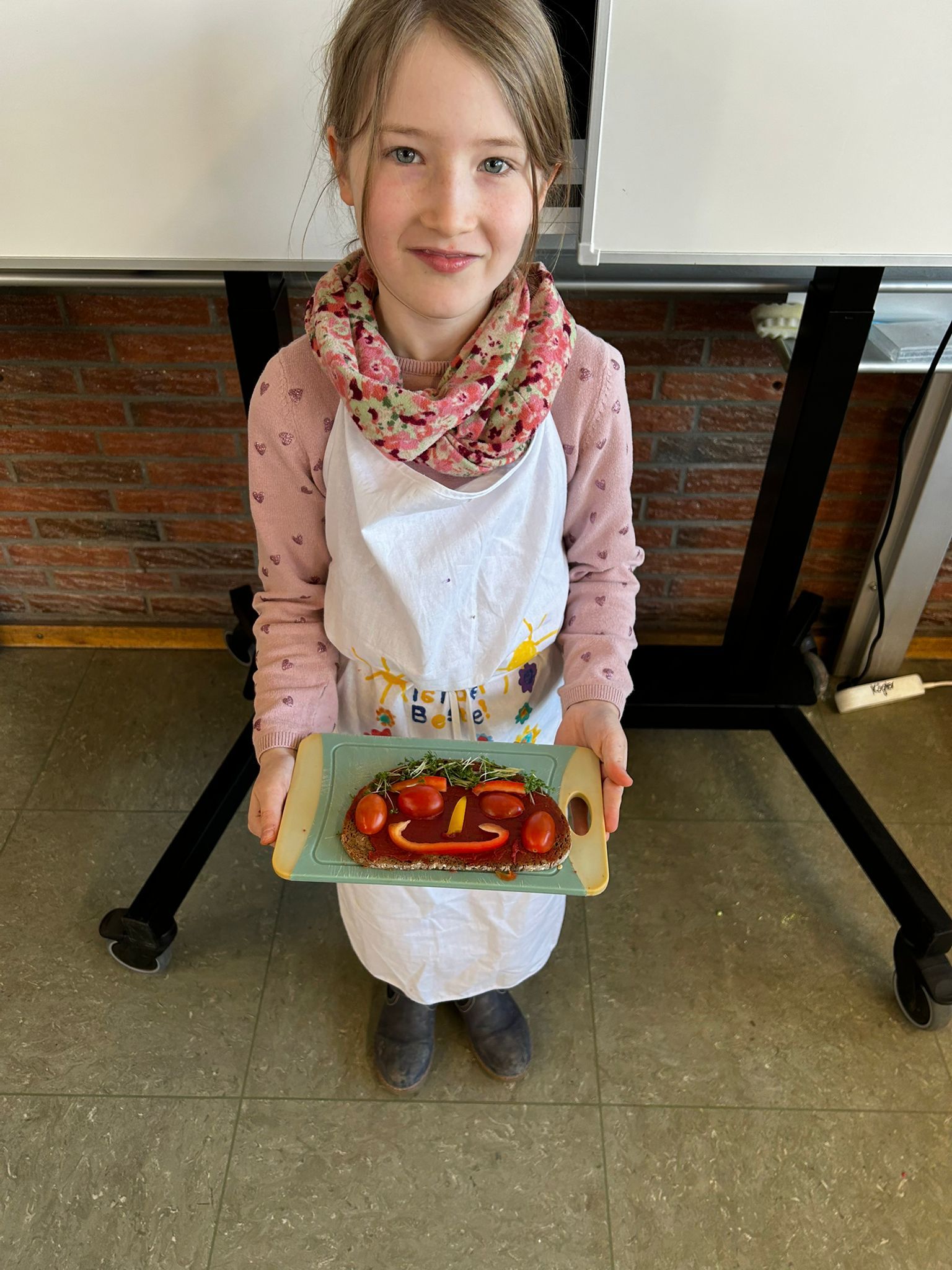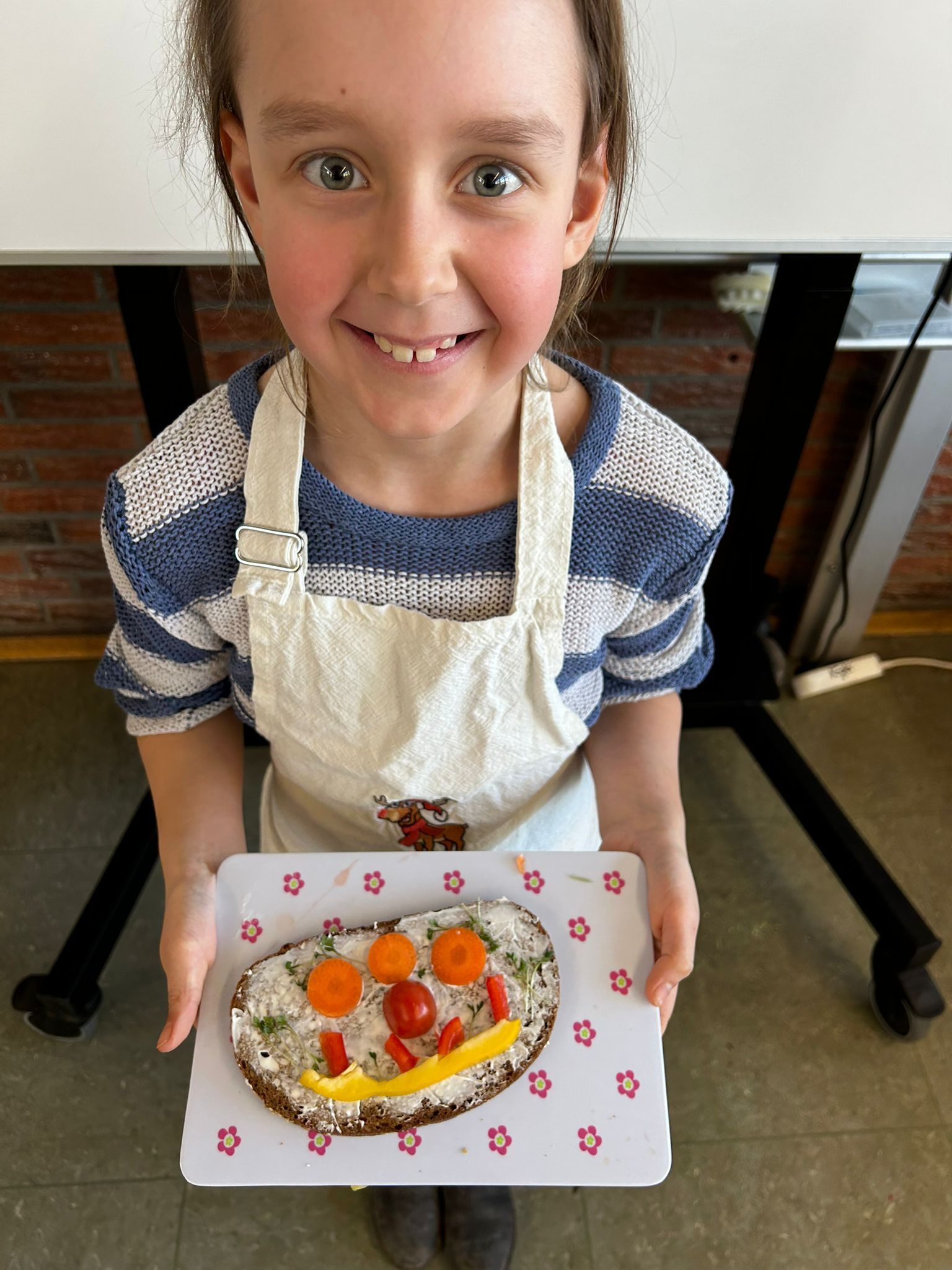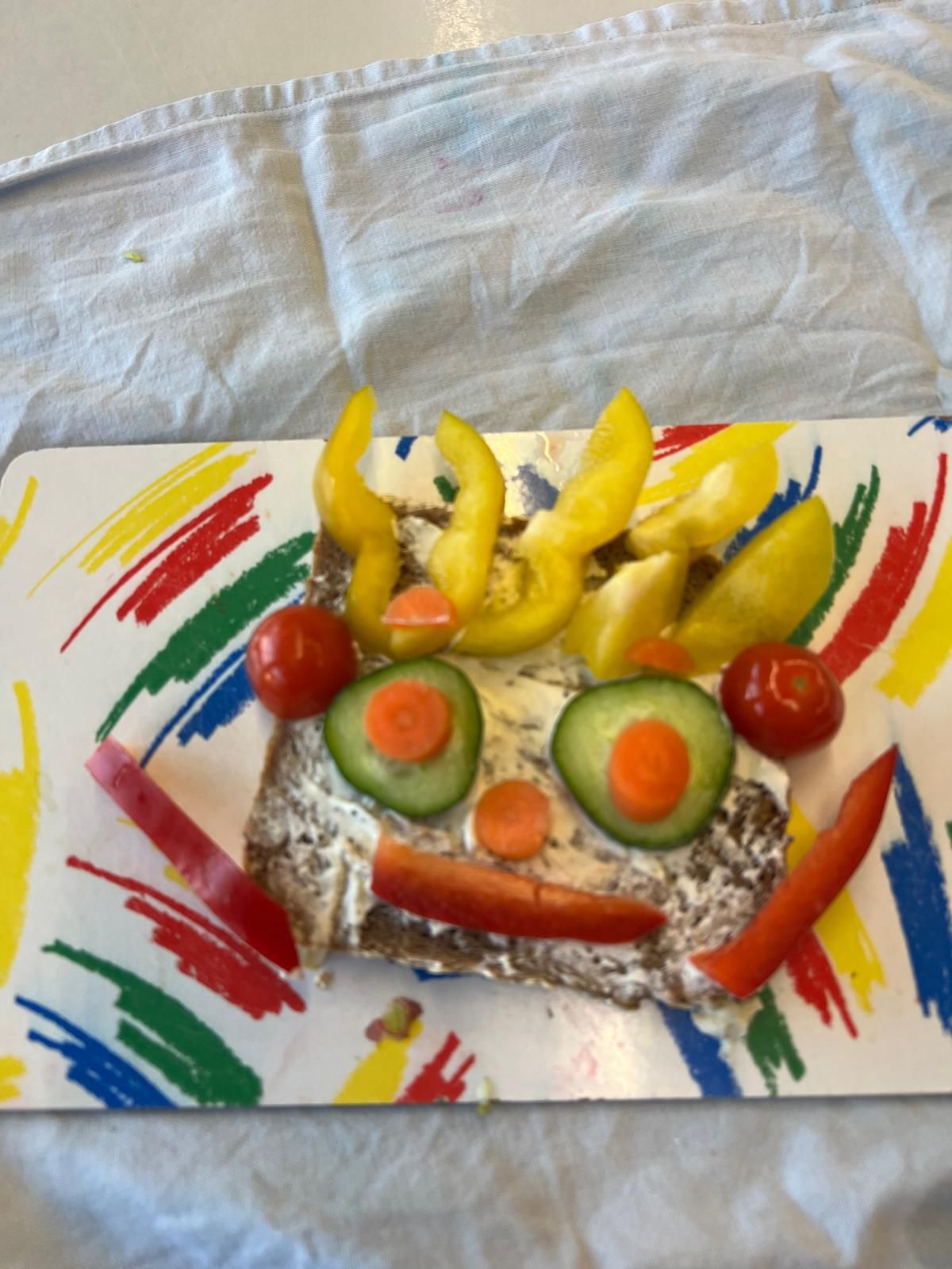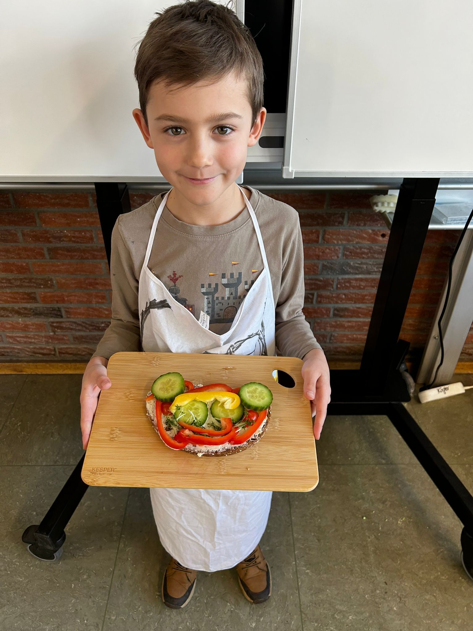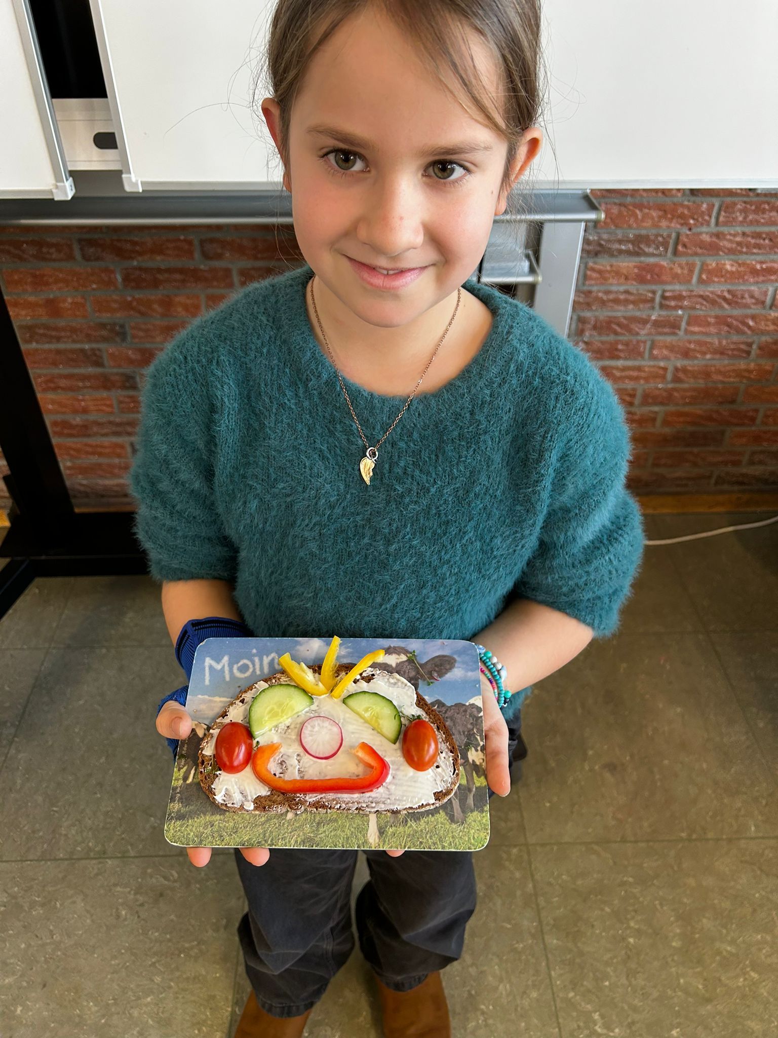 Im weiteren Verlauf gestalteten die Kinder Pausenbrot-Gesichter und lernten dabei spielerisch, wie man mit ausgewogenen Zutaten arbeitet. Nach gründlicher Handhygiene ging es ans Schneiden: Paprika, Radieschen, Gurke, Karotten, Tomaten und Kresse wurden zu bunten Brotgesichtern verarbeitet. Die übrig gebliebenen Gemüsesorten fanden rasch ihren Weg in den Mund.