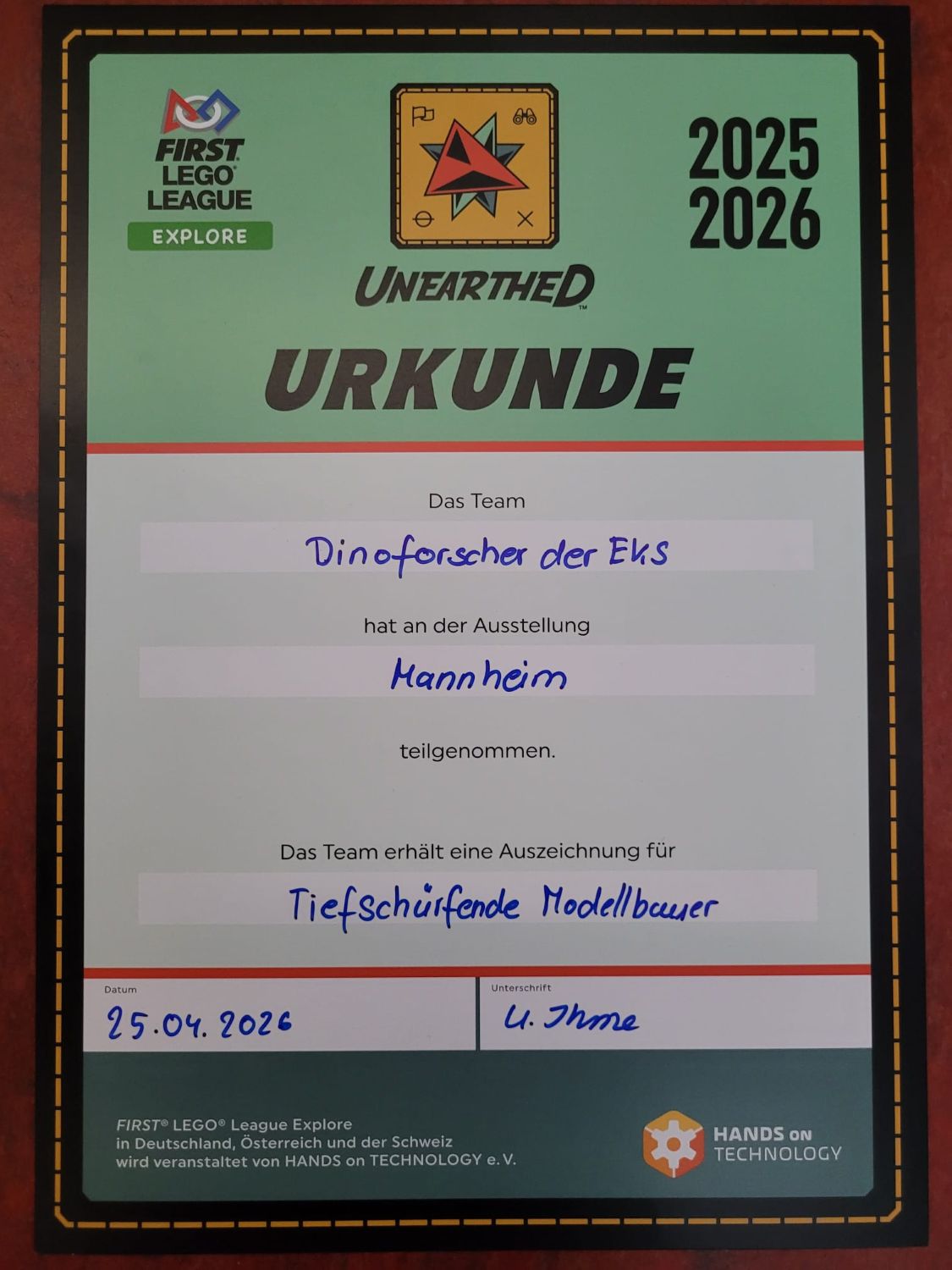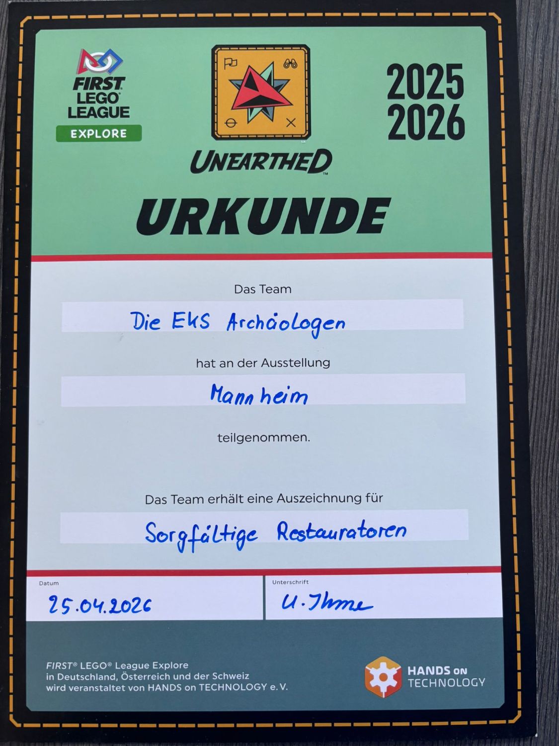 Am Samstag, den 25. April, war die EKS mit gleich zwei Gruppen bei der First Lego League Explore vertreten. Die jungen Forscherinnen und Forscher präsentierten dort stolz die Ergebnisse aus insgesamt 13 Sitzungen, in denen sie sich intensiv mit dem Thema Archäologie beschäftigt hatten.