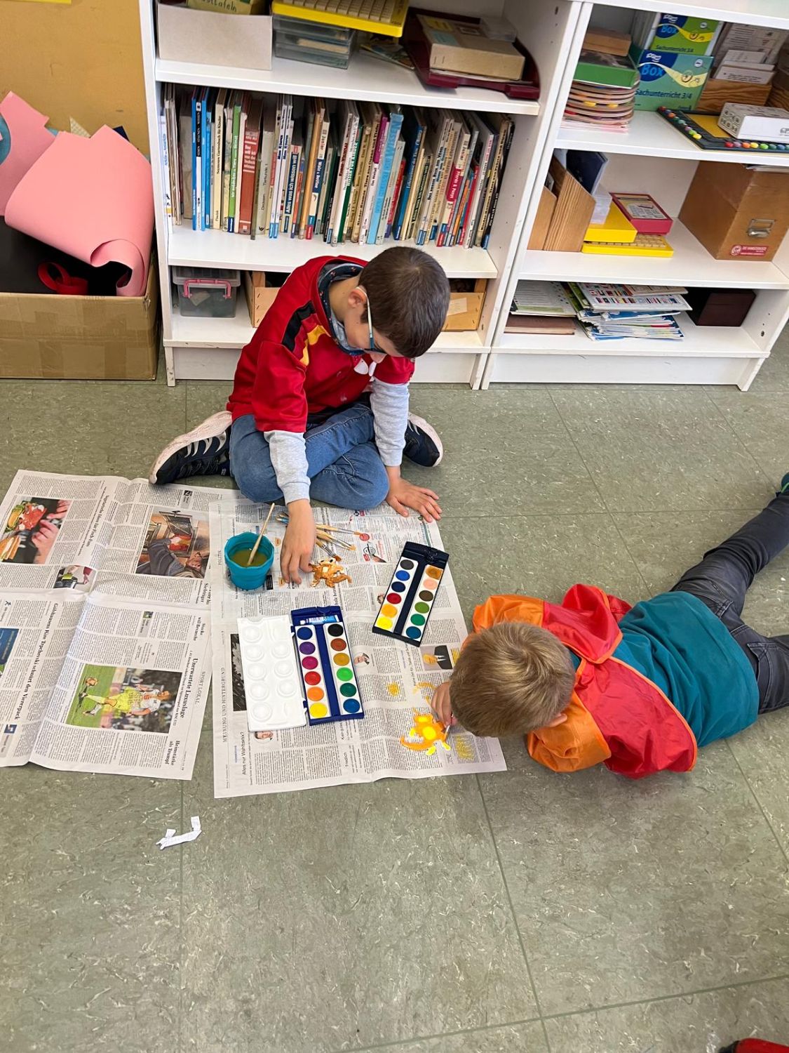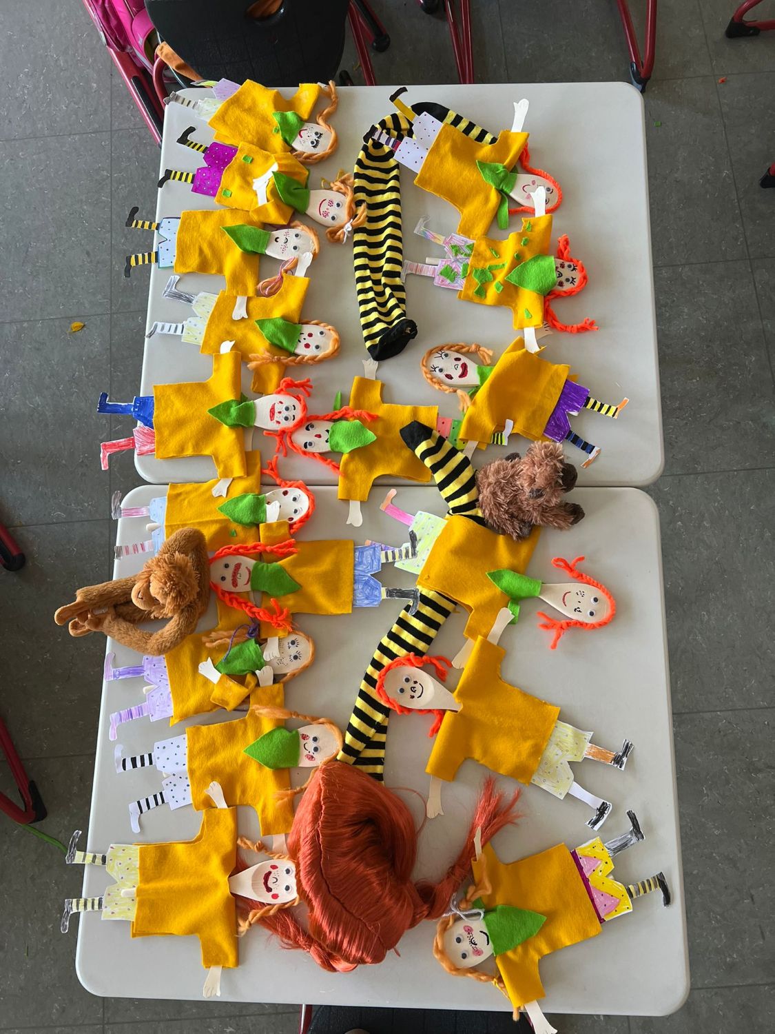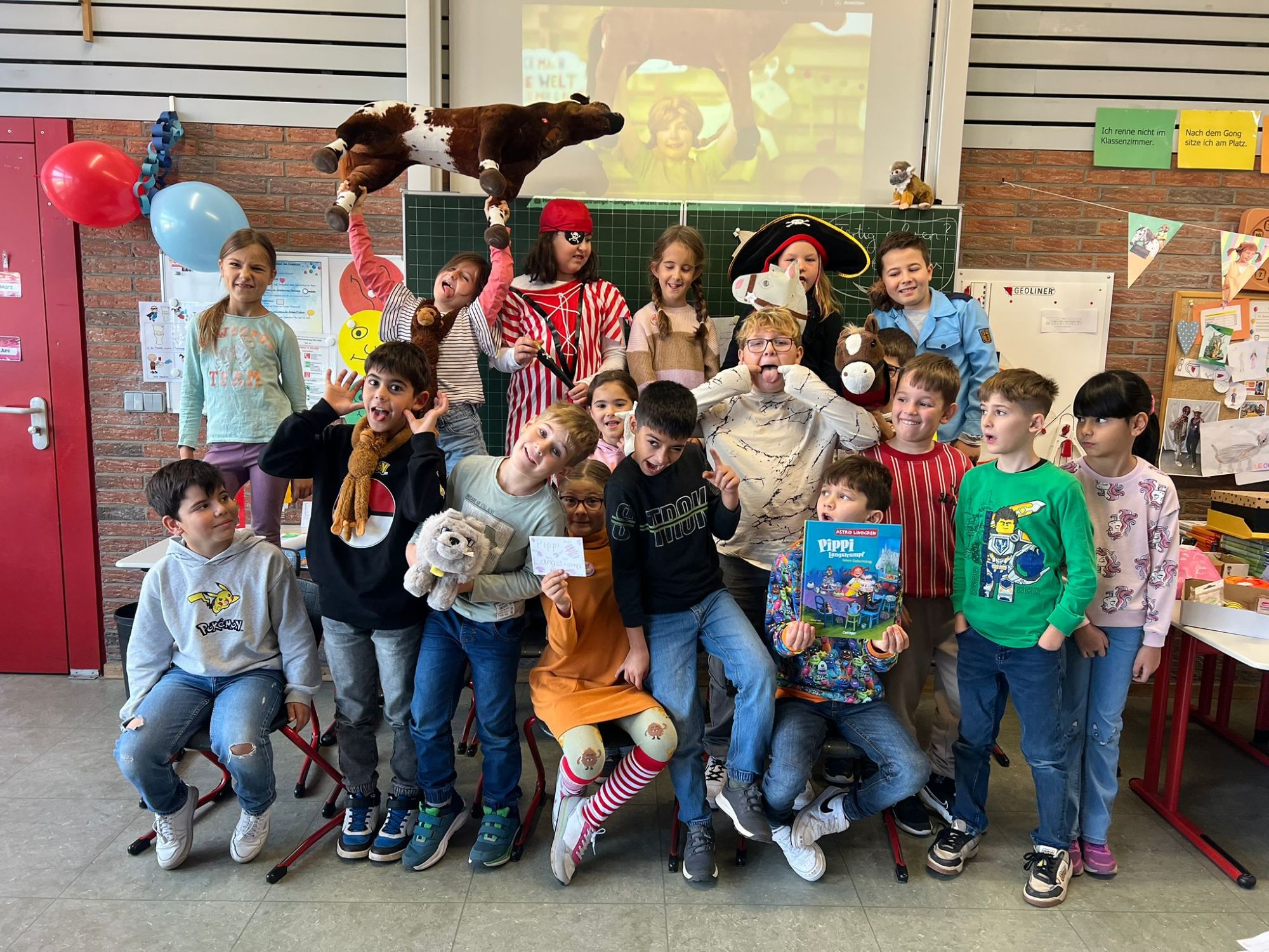 Das nahm sich die Klasse 3b der Erich Kästner-Grundschule zum Anlass, dieses Jubiläum im Rahmen der Frederick-Tage 2025 gebührend zu feiern. Neben dem gemeinsamen Lesen des Buches und Arbeiten im Begleitheft, wurden auch die Helden Pippi, Herr Nilsson oder Kleiner Onkel von den Kindern mit Fimo geformt und angemalt. Die Superheldin wurde als Löffelpuppe gebastelt und zwischendurch sangen die Kinder den mitreißenden Pippi Langstrumpf-Song immer wieder und tanzten dabei vergnügt. Mit dem Besuch der Lesepatin Frau Wipfler konnten wir so im Projekt auch unsere Ausrichtung als Leseschule unterstreichen. Auch der sportlich, gemeinschaftliche Pippi-Spaß kam nicht zu kurz. „Nicht den Boden berühren“ und als Team eine Strecke mit Matten zurücklegen, dass war lustig und anstrengend zugleich. Es bedurfte einiger Absprachen, um zum Ziel zu kommen.