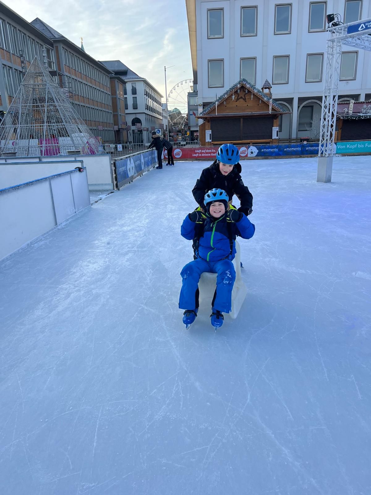 Bei herrlichem Sonnenschein begaben sich alle Kinder mutig auf das Eis und fanden schnell Sicherheit auf wackeligen Schlittschuhen. Gegenseitiges Helfen, Motivieren und dem anderen Vertrauen schenken wurden spielerisch trainiert und stärkten so das „Wir“-Gefühl. Aus manchem ungeübten Fahrer wurde so ein rasanter Kufengleiter. Glücklich über ihre gelungenen Fahrkünste besuchte dann die Klasse noch den Kinderweihnachtsmarkt vor der Stephanskirche. So manches Kind, hungrig geworden durch zahlreiche Pirouetten und Wettläufe auf dem Eis, verspeiste noch so manche Leckerei.