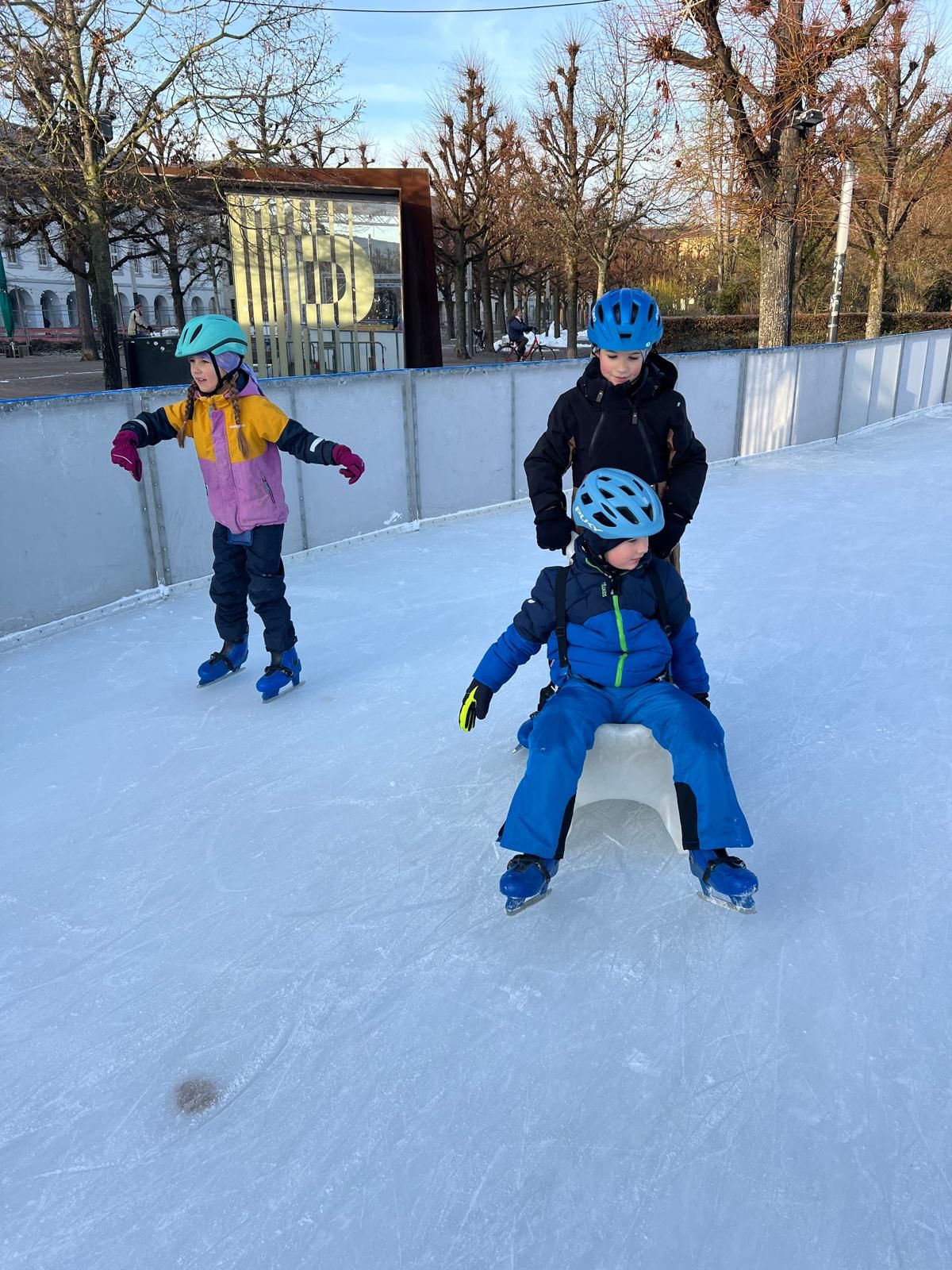 Endlich konnten die Schülerinnen und Schüler der Klasse 3b am letzten Dienstag mit ihrer Klassenlehrerin Frau Klauber und den begleitenden Eltern vor der schönen Kulisse des Karlsruher Barockschlosses ihre Runden auf der großen Eisbahn drehen.