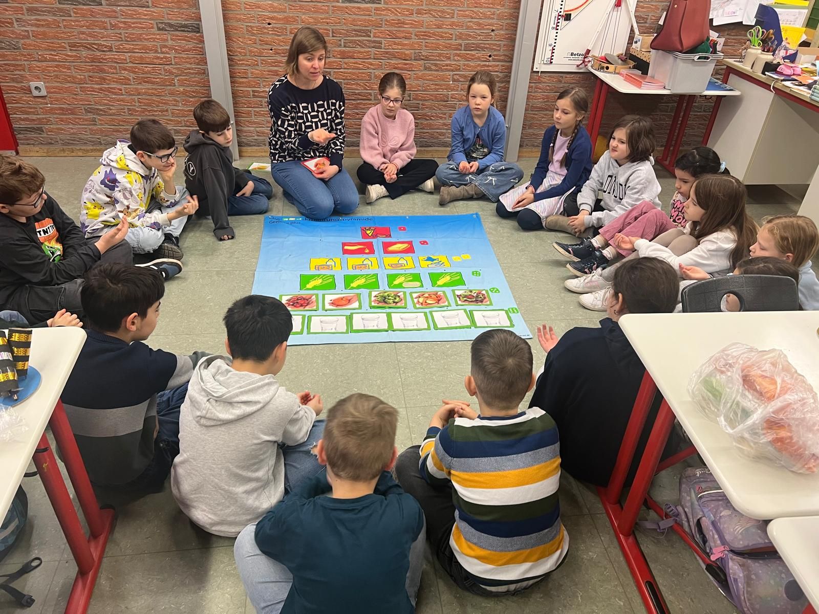 Zunächst stand die Ernährungspyramide im Mittelpunkt. Die Farben der Ernährungspyramide wurden besprochen, um zu verdeutlichen, welche Lebensmittelgruppen in der täglichen Mahlzeit eine Rolle spielen. Ein besonders anschaulicher Vergleich mit Familien die in einem Haus und seinen Stockwerken leben, begeisterte die Schülerinnen und Schüler.