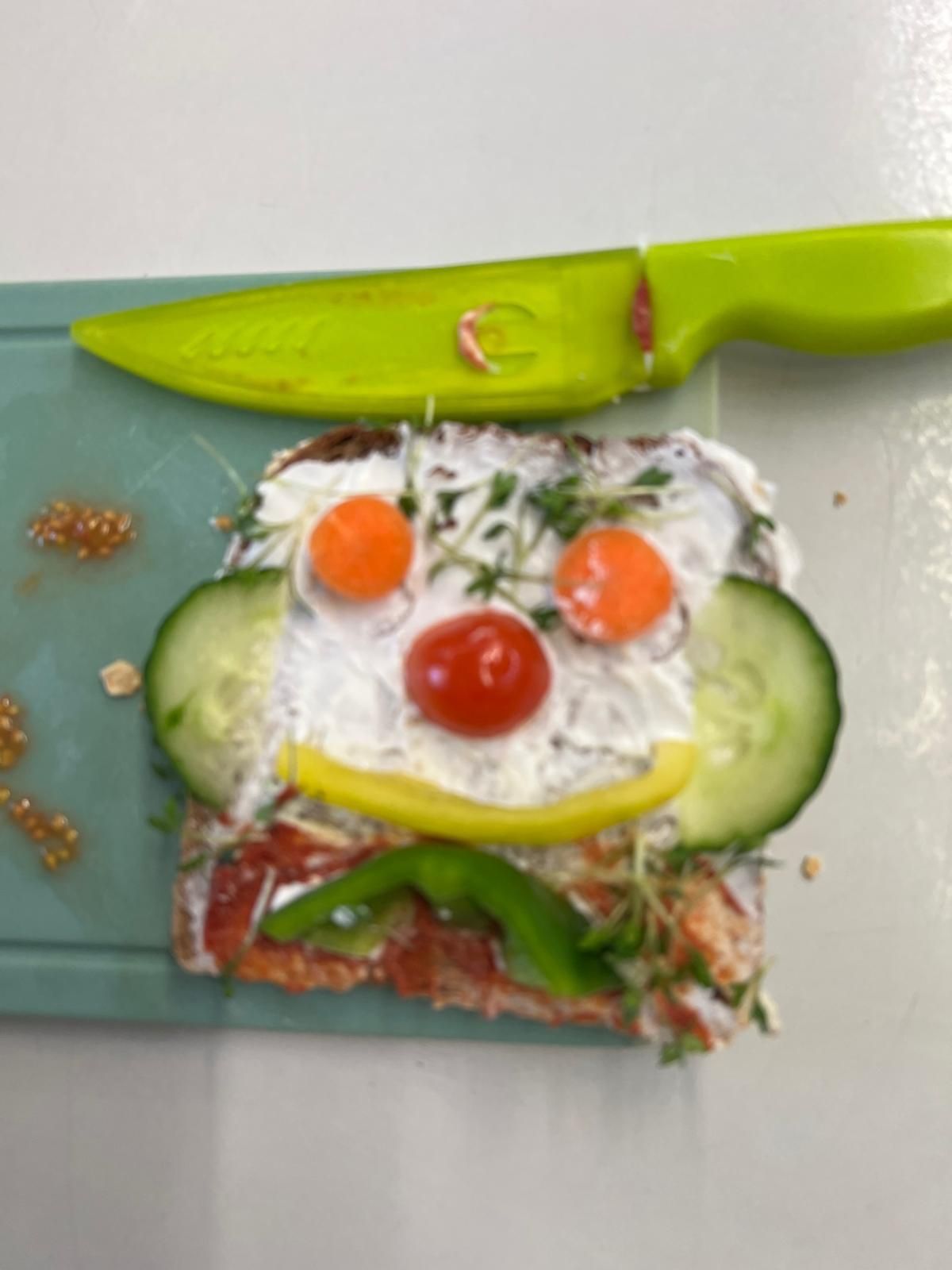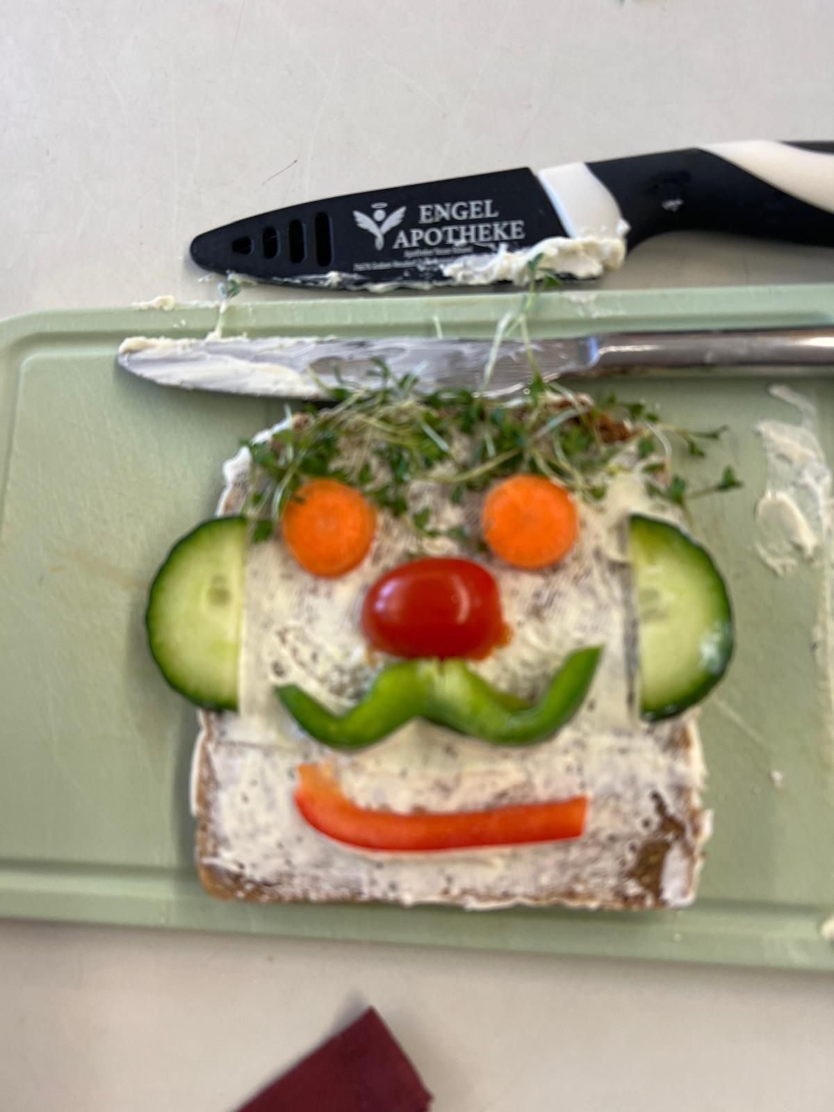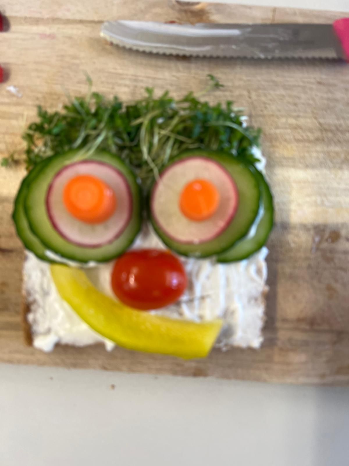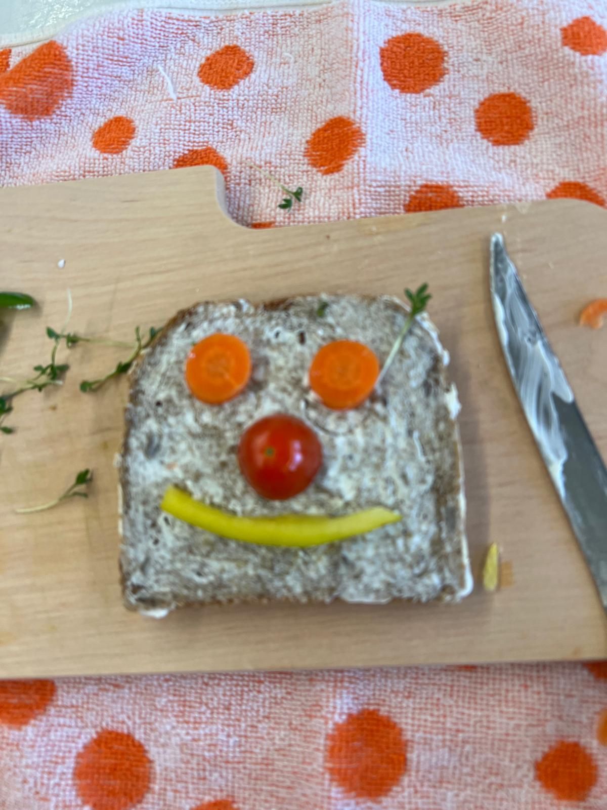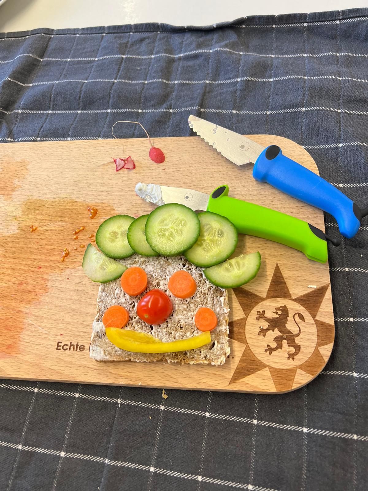Im weiteren Verlauf gestalteten die Kinder Pausenbrot-Gesichter und lernten dabei spielerisch, wie man mit ausgewogenen Zutaten arbeitet. Nach gründlicher Handhygiene ging es ans Schneiden: Paprika, Radieschen, Gurke, Karotten, Tomaten und Kresse wurden zu bunten Brotgesichtern verarbeitet. Die übrig gebliebenen Gemüsesorten fanden rasch ihren Weg in den Mund.
