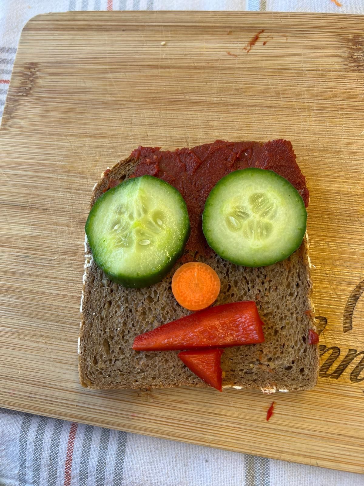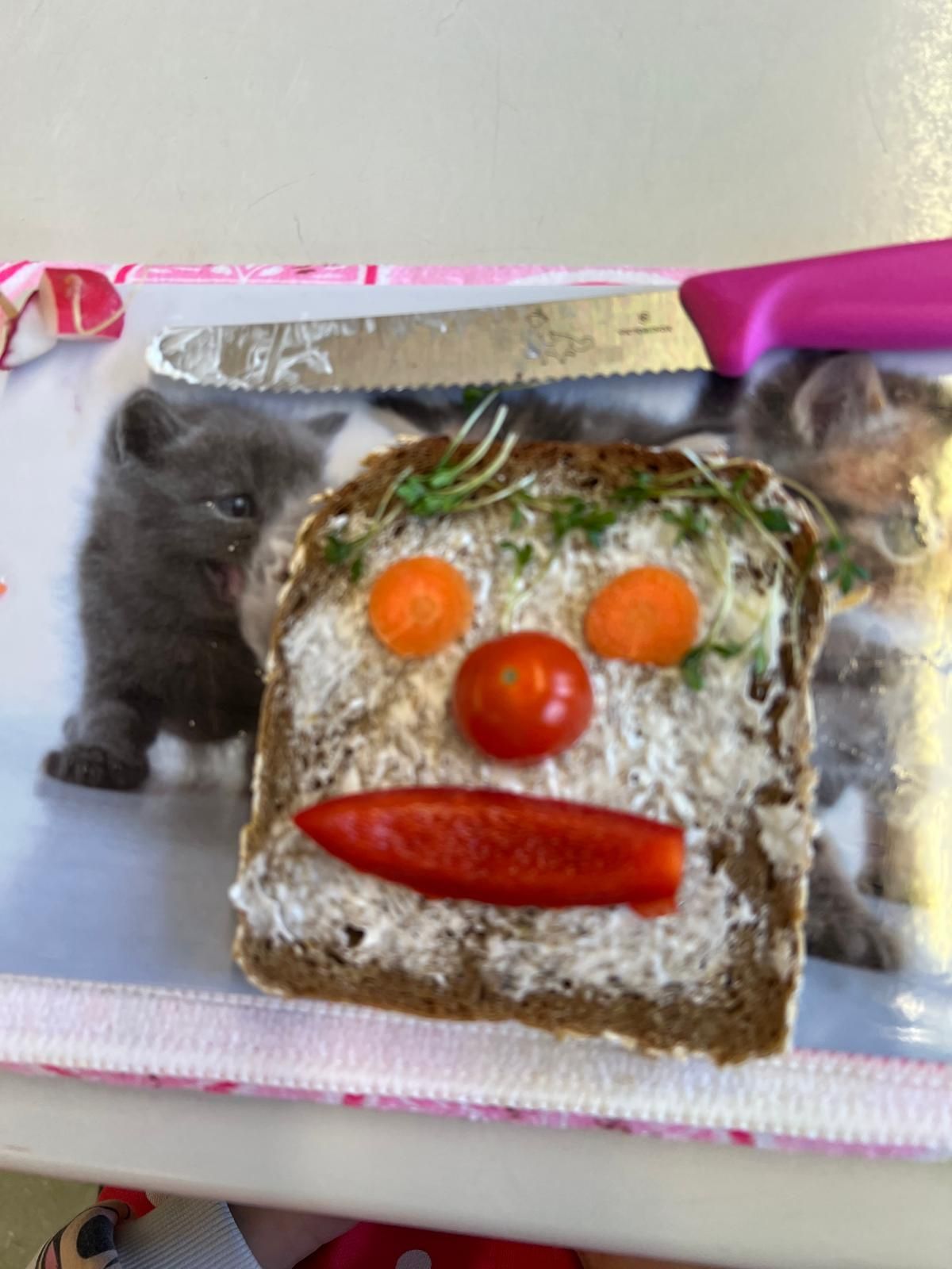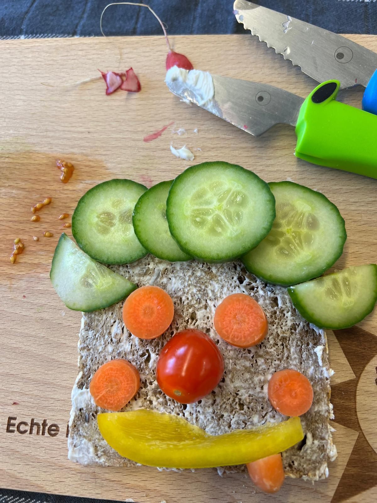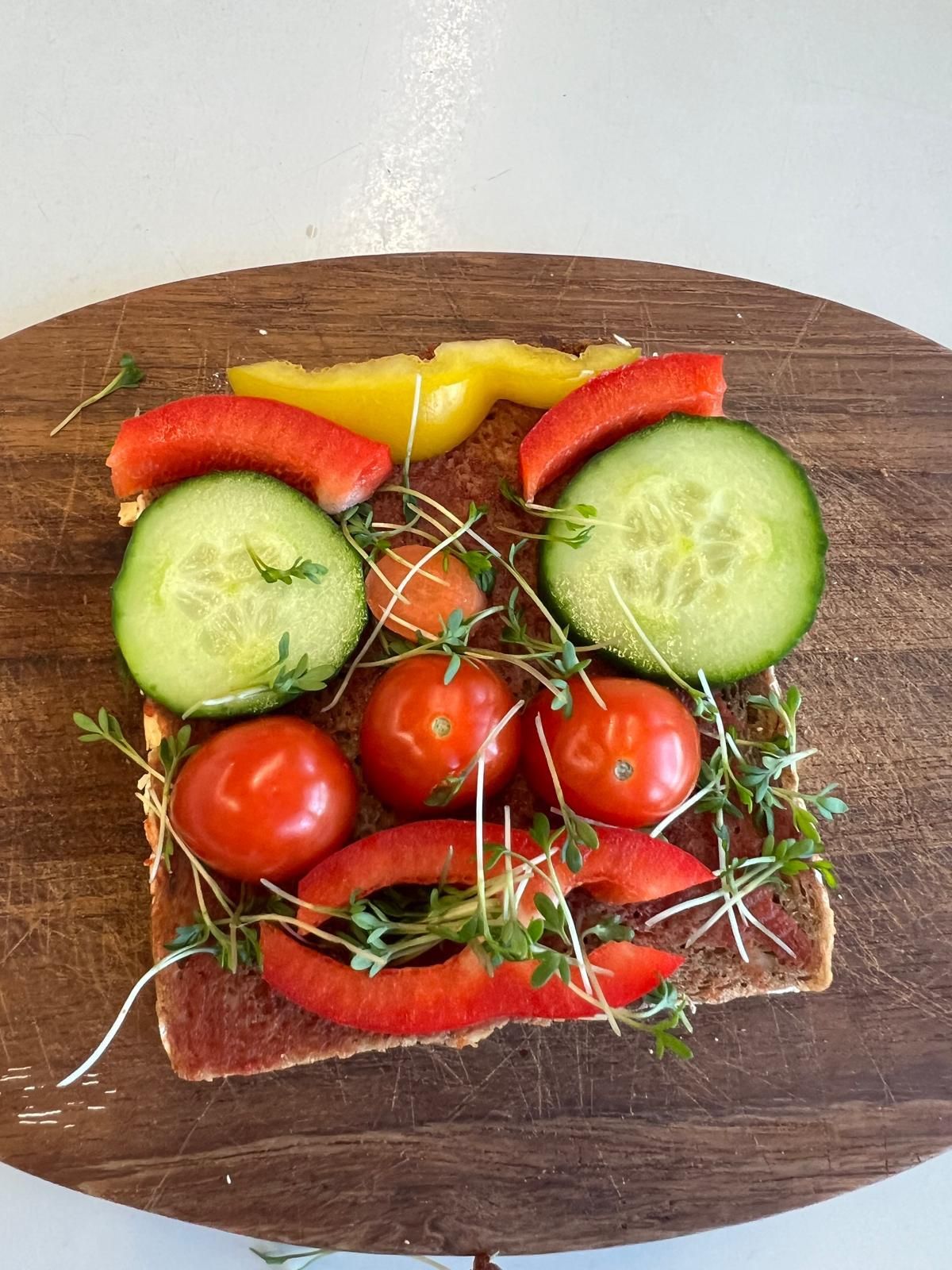 Im weiteren Verlauf gestalteten die Kinder Pausenbrot-Gesichter und lernten dabei spielerisch, wie man mit ausgewogenen Zutaten arbeitet. Nach gründlicher Handhygiene ging es ans Schneiden: Paprika, Radieschen, Gurke, Karotten, Tomaten und Kresse wurden zu bunten Brotgesichtern verarbeitet. Die übrig gebliebenen Gemüsesorten fanden rasch ihren Weg in den Mund.