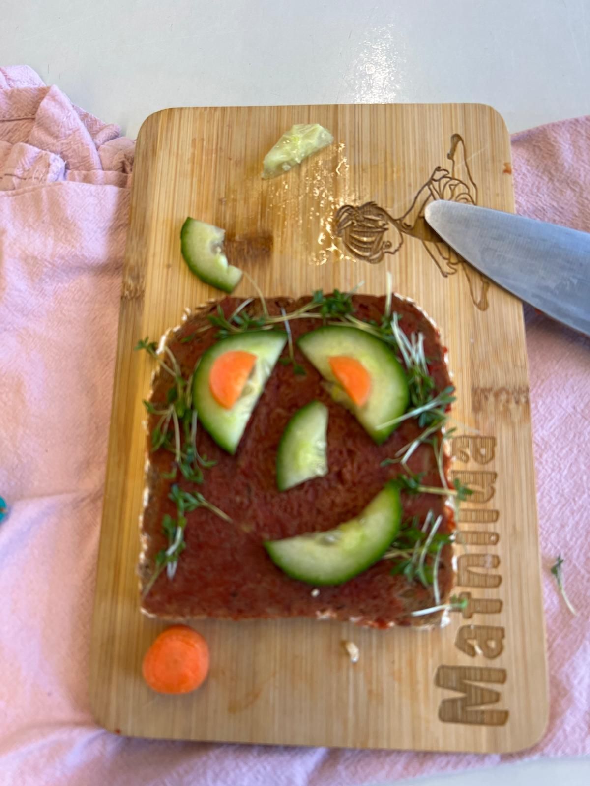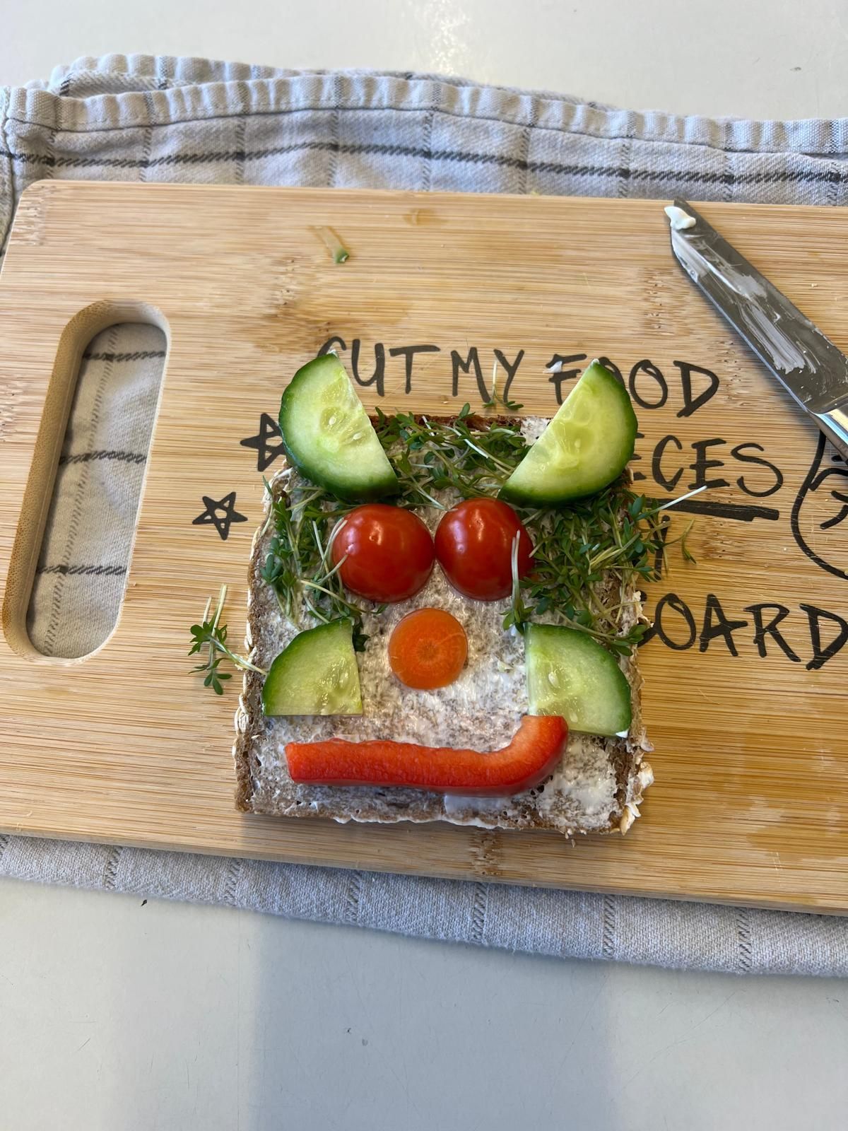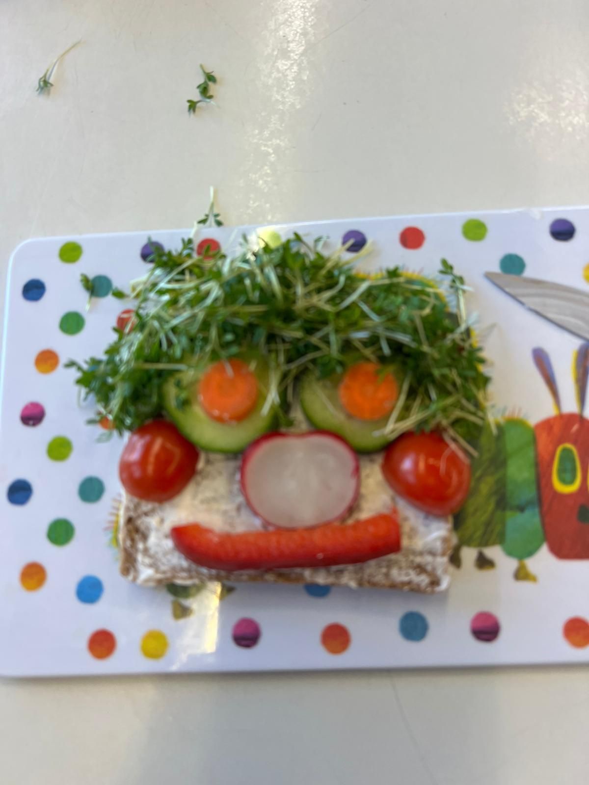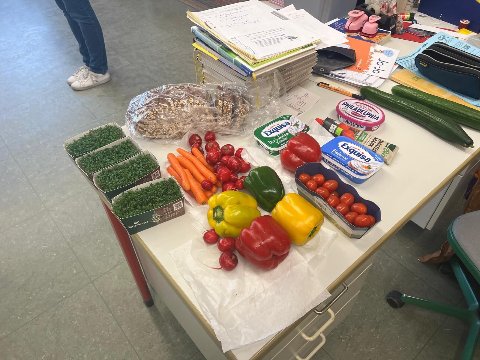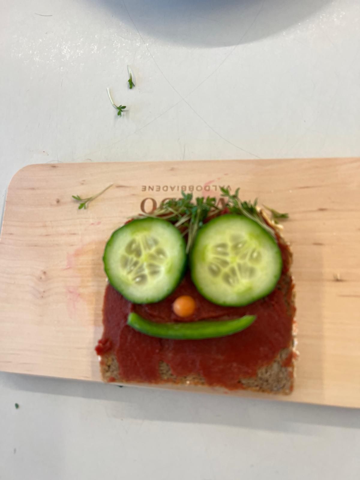 Im weiteren Verlauf gestalteten die Kinder Pausenbrot-Gesichter und lernten dabei spielerisch, wie man mit ausgewogenen Zutaten arbeitet. Nach gründlicher Handhygiene ging es ans Schneiden: Paprika, Radieschen, Gurke, Karotten, Tomaten und Kresse wurden zu bunten Brotgesichtern verarbeitet. Die übrig gebliebenen Gemüsesorten fanden rasch ihren Weg in den Mund.