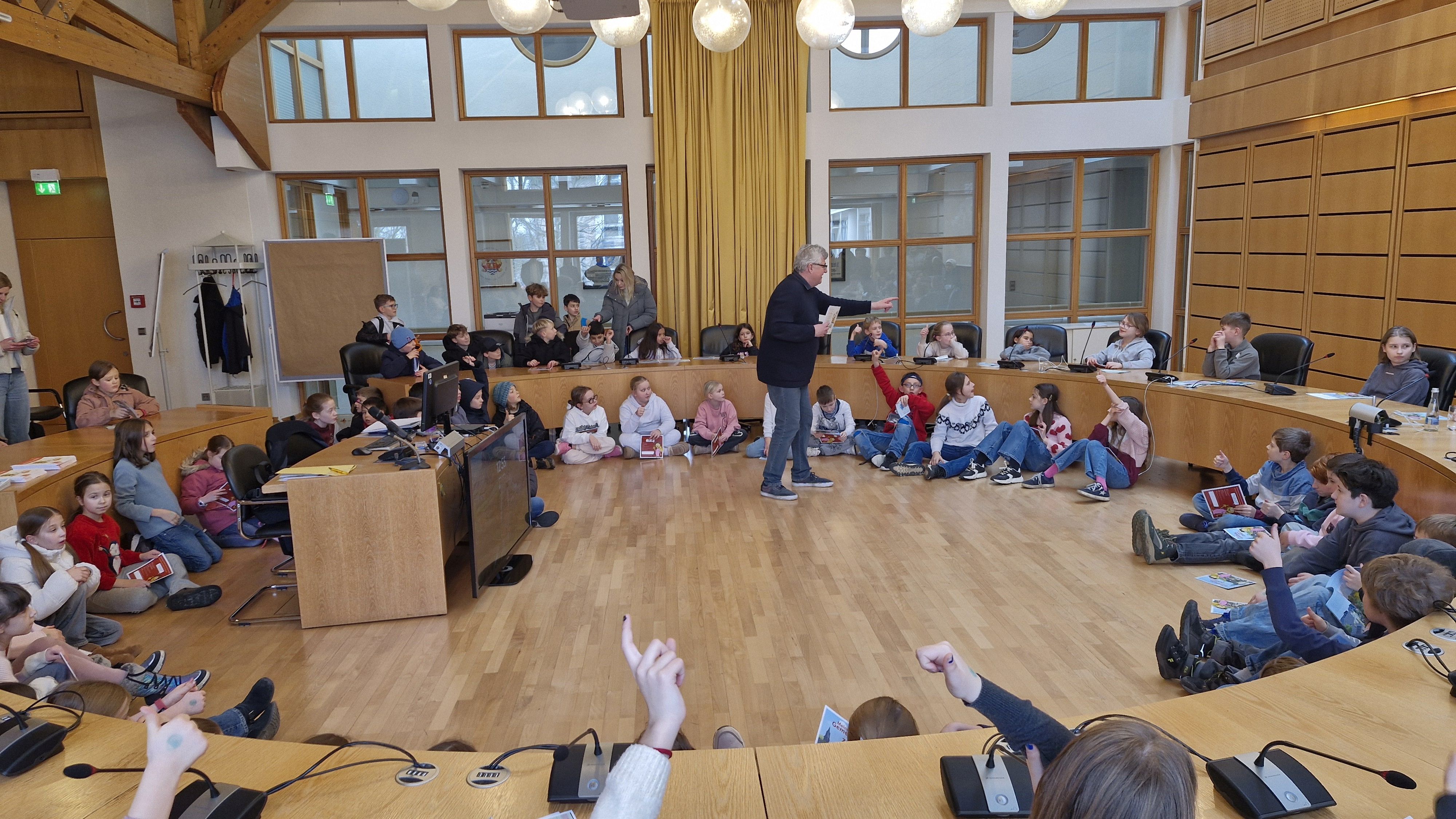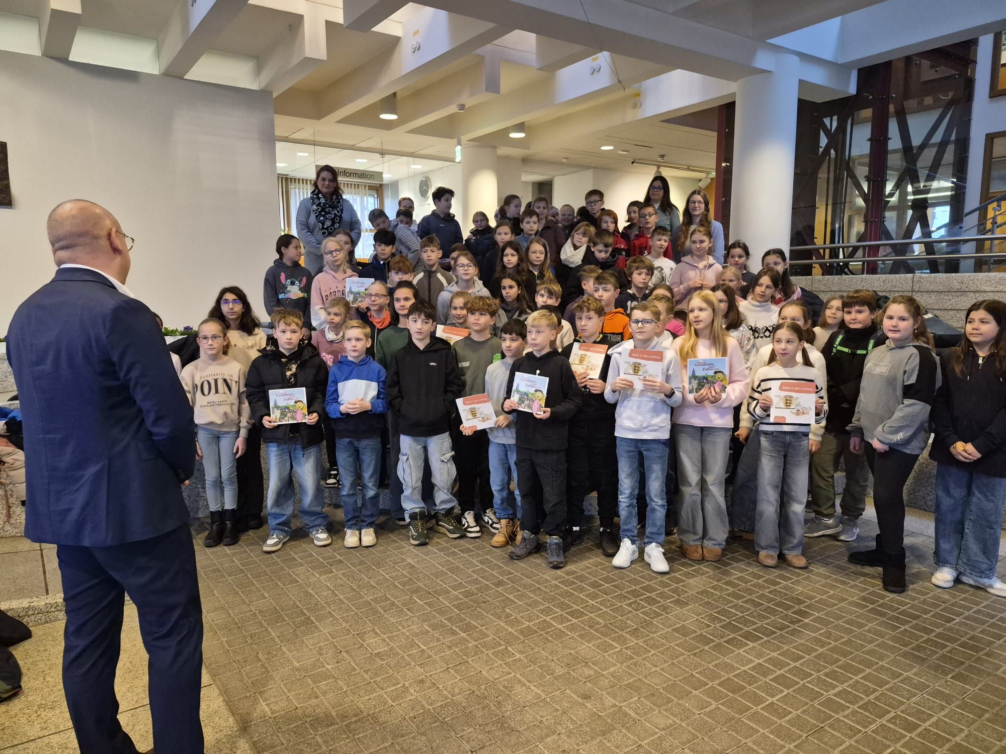 Am Freitag, den 30.01.26 erwartete die Klasse 4 ein Lerngang der besonderen Art: Die Kinder wurden ins Rathaus eingeladen und durften hinter die Kulissen schauen. Jedes Amt hatte eine neue Überraschung für die Gruppen parat: Der Tag startete mit einem interessanten Gespräch mit Bürgermeister Christian Eheim und einer Leserunde mit der Landtagsabgeordneten Bettina Schreitmüller im beeindruckenden Ratssaal der Gemeinde. Mit vielen kleinen, aber feinen Angeboten ging es weiter: Quizspiele und Memorys im Bürgerbüro und Ordnungsamt, Münzenberge schätzen und anschließendes Zählen durch den Münzzähler im Rechnungsamt, einer „fingierten“ Trauung mit Ringen, Schlips, Schleier und gestreuten Blütenblättern im Standesamt und viele Aktionen mehr. Ein Highlight war sicher auch der Besuch des Bauhofes, wo den Kindern die Baumaschinen gezeigt wurden und sie diese unter der strengen Aufsicht der Bauhofmitarbeiter auch teilweise bedienen durften. Völlig erschöpft, viel schlauer und zufrieden starteten die Kinder im Anschluss in ihr wohlverdientes, verspätetes Wochenende.