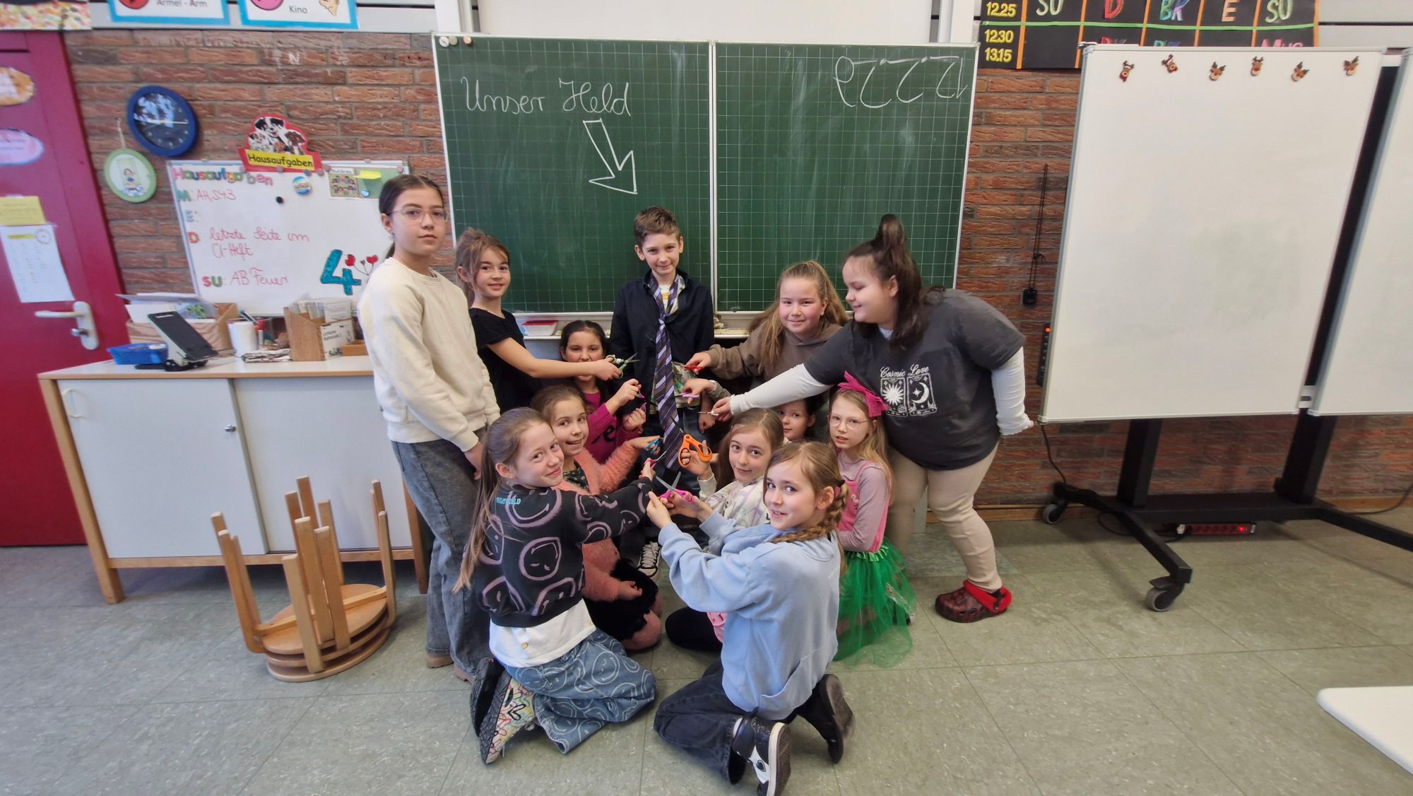 Am Schmutzigen Donnerstag, genannt Weiberfasnacht, machte ein Schüler der 4a den Mädels seiner Klasse eine besondere Freude. Er kam mit einer Krawatte zur Schule und die wilden Weiber der 4a konnten den lachenden Oscar „überfallen“ und seine Krawatte abschneiden. Wie bekannt ist, gehört dieser Tag den „Weibern“, was die Mädels natürlich nutzen. Gerne hätten sich auch die Jungs der Klasse beteiligt, aber das Vergnügen blieb allein den Mädels überlassen. Die errungene Beute wurde gebührend gefeiert und als Trophäe an die Wand des Klassenzimmers gehängt.