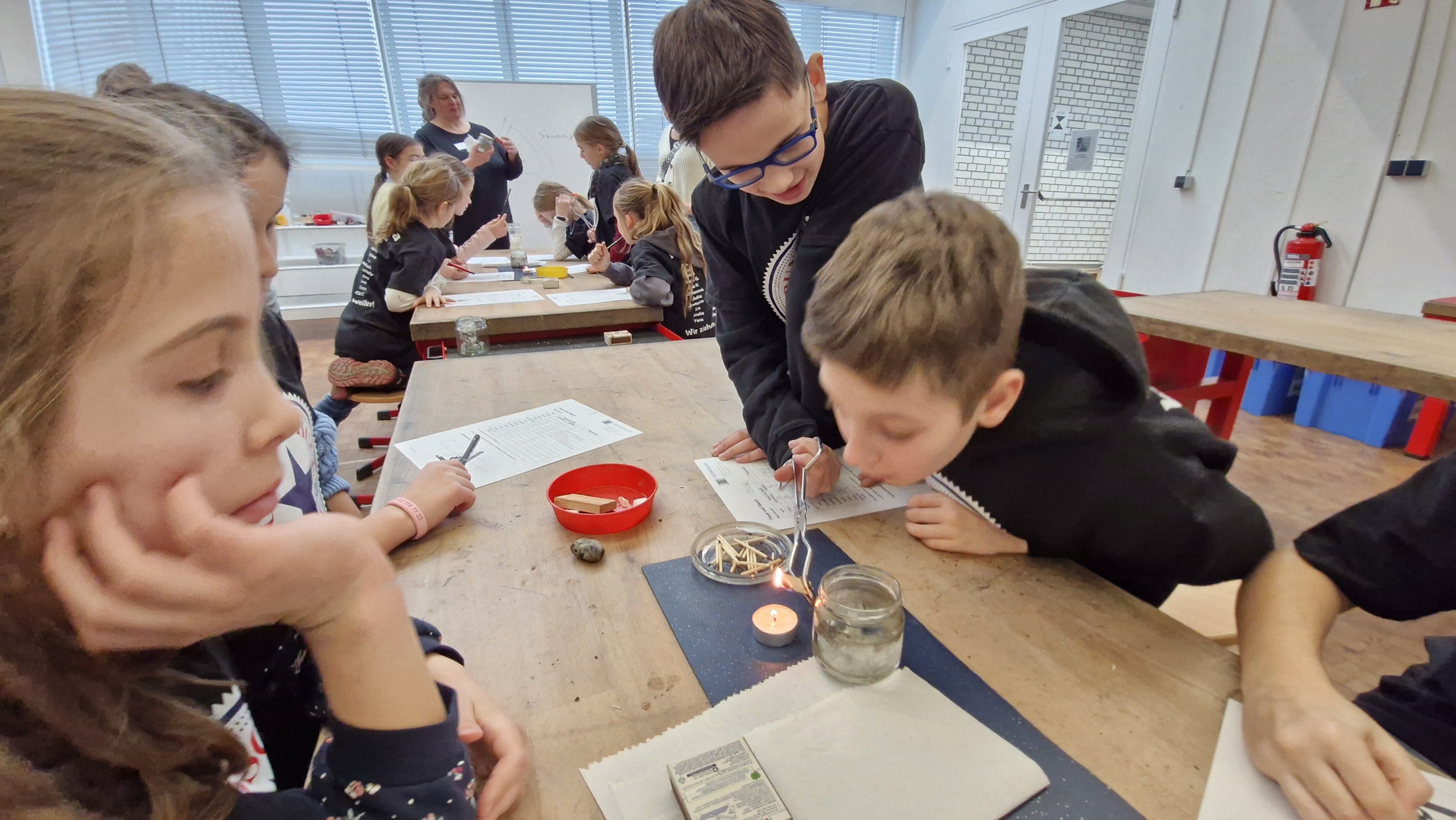 Um 11 Uhr trafen sich alle wieder, um mit der Dampflokomotive die „kürzeste Bahnstrecke Deutschlands“ zu befahren. Anschließend gab es eine schnelle Vesperpause, von der aus es direkt in den Kurs „Feuer und Rauch“ ging. Dort experimentierten die Kinder zum Thema Rauchmelder und machten verschiedene Brennversuche. Ohne Probleme erarbeiteten die Ekis das Feuerdreieck und nahmen viele spannende Erkenntnisse in die nächste Sachunterricht-Stunde mit.