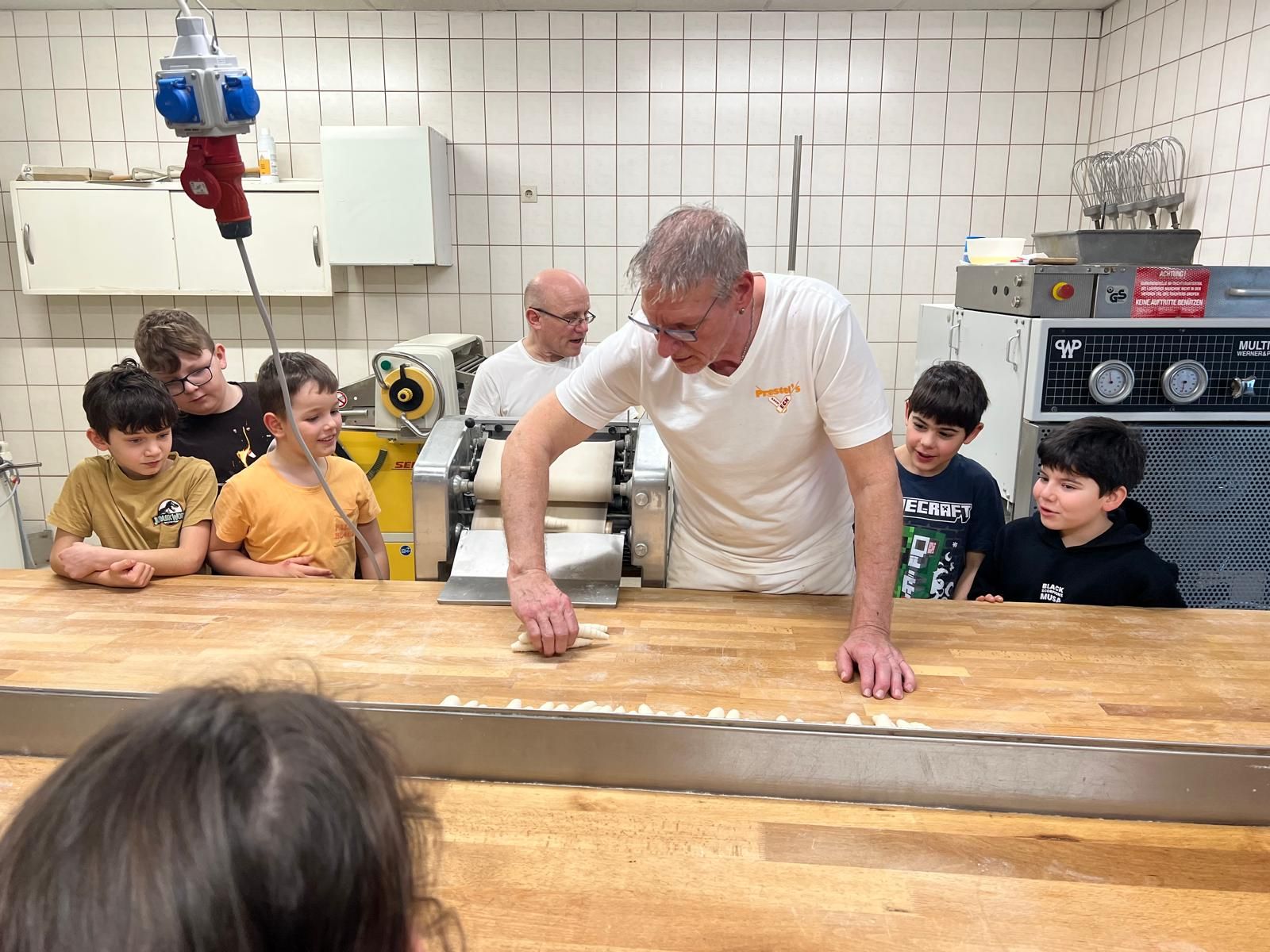 Bäcker Prestel und sein Bäcker Herr Streicher hatten bereits die halbe Nacht gearbeitet und schon im Laden konnten die Kinder die Vielfalt der Backwaren sehen. In der Backstube selbst war schon von den Bäckern einiges vorbereitet worden. Alle Kinder standen um den Arbeitstisch herum und sahen zu, wie die einzelnen Zutaten für den Brezelteig abgewogen und in den großen Knetgeräten bearbeitet wurden. Herr Prestel und Herr Streicher erklärten ihre Arbeitsschritte und die Kinder konnten so ihre Handgriffe nachvollziehen.