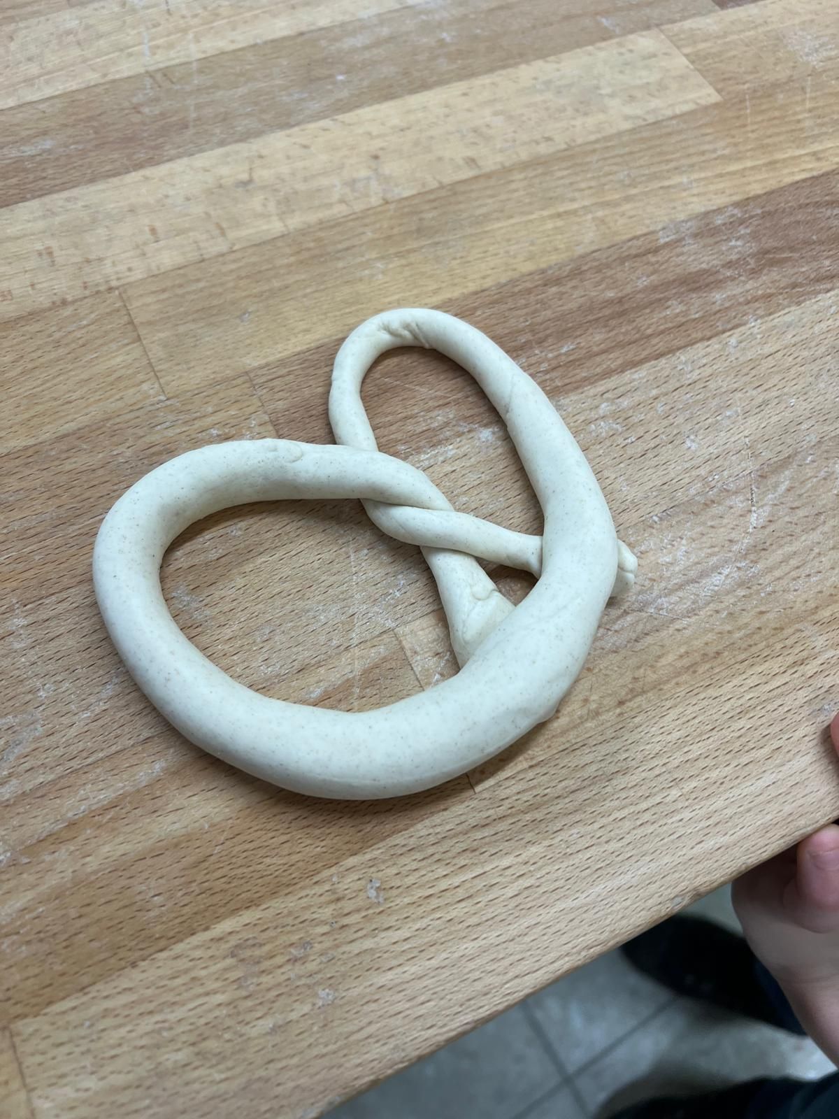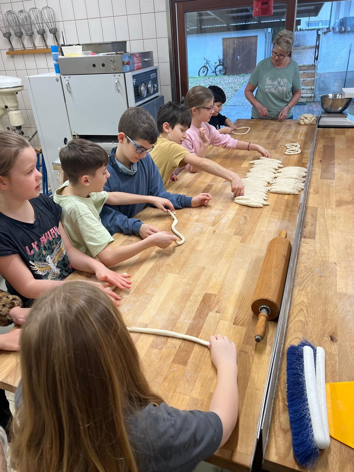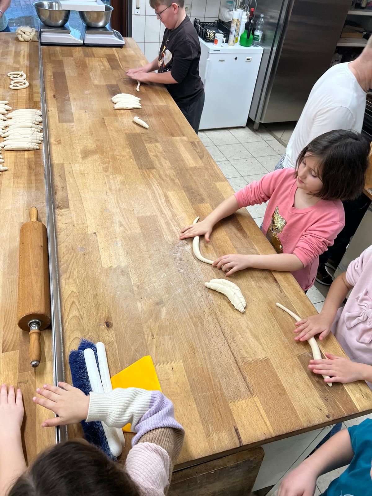 Mit sorgfältig gewaschenen Händen durften dann diese ihr Bäckerglück versuchen und eigene Brezel formen. Das war gar nicht so leicht, aber jeder brachte mindestens eine schöne Brezel auf das Blech. Es wurde viel gelacht und es machte sehr viel Spaß. Nachdem die Brezeln in einem Laugenbad getaucht, angeritzt und gesalzen wurden, mussten die Meisterwerke kurz ruhen. Zum Schluss „schoss“ Bäcker Prestel die Brezel in den Backofen. Beeindruckt stellten die Kinder am Ende fest, wie viel Handarbeit in der Herstellung von Backwaren steckt.